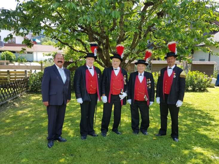 In seiner Laudatio würdigte der 1. Vorsitzende Josef Roth die Verdienste der Jubilare. Am Fronleichnamstag vor 60 Jahren sei Werner Kuderer als Gewehrträger in die Bürgerwehr eingetreten. Seither zählte er über Jahrzehnte hinweg zu den treuesten Mitgliedern der Bürgerwehr. Ihm sei kein Weg zu weit gewesen, wenn es darum gehe, der Bürgerwehr zu dienen und bei den Auftritten dabei zu sein. Das Vertrauen der Kameraden kam auch darin zum Ausdruck, dass er zum Feldwebel gewählt wurde und dieses Amt von 1989 bis 2007 gewissenhaft und mit vorbildlichem Einsatz führte. Als Mitglied der Vorstandschaft habe er in dieser Zeit die Geschicke der Bürgerwehr entscheidend mitgeprägt. 2007 wurde er zum Ehrenmitglied und Ehrenfeldwebel ernannt.