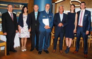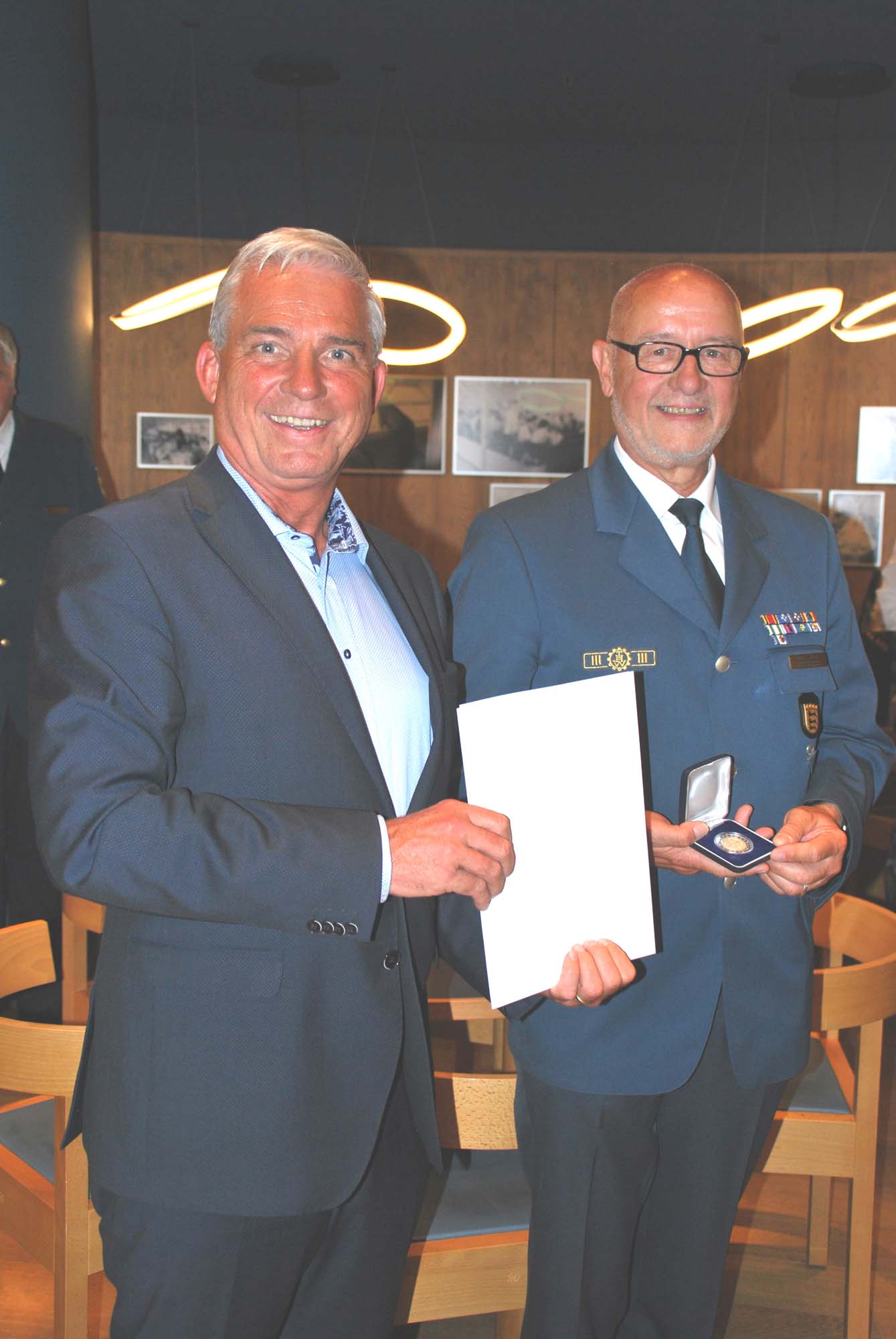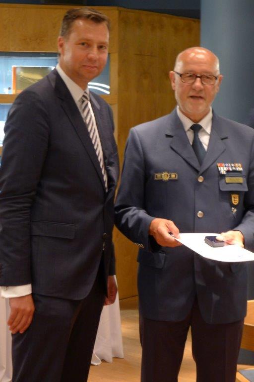 Für seine über die Ländergrenzen hinausreichenden, bundesweiten Impulse und Aktivitäten für das THW überreichte ihm der Präsident der THW-Bundesvereinigung e.V., Stephan Mayer MdB, als höchste Auszeichnung der Vereinigung, die Ehrennadel der THW-Helfervereinigung in Gold.