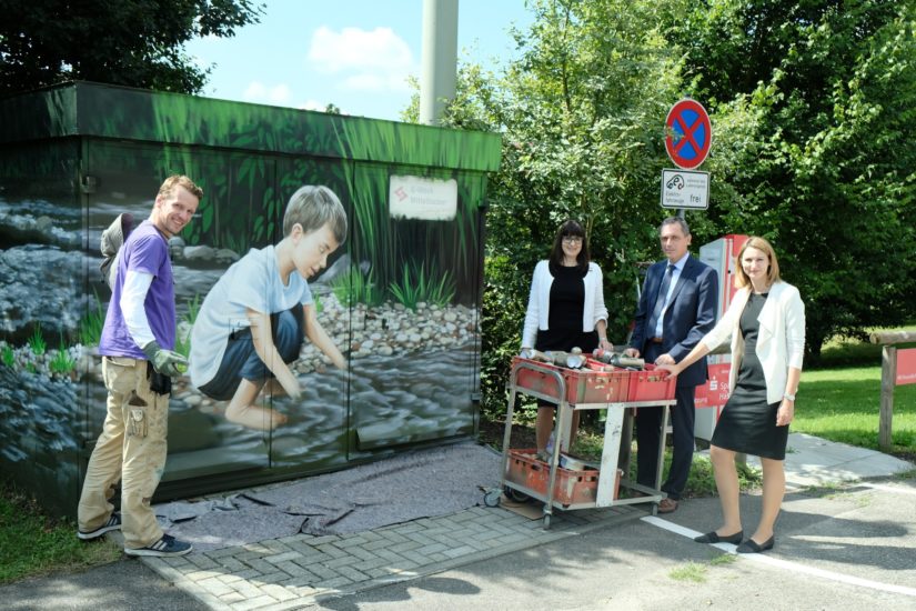 Am gestrigen Donnerstag war die Trafostation am Zeller Sonnenparkplatz dran. Markus Ronge griff zur Spraydose, und innerhalb von nur einem Tag erhielt die 3,60 Meter lange, 3 Meter breite und 2,30 Meter hohe Station eine neue Fassadengestaltung. Das Motiv, das gemeinsam mit der Stadt Zell entstanden ist, zeigt einen Jungen, der im nur einen Steinwurf entfernten Bachsteig spielt. Bürgermeister Günter Pfundstein: »Unsere Trafostation auf dem Sonnenparkplatz – direkt neben der E-Tankstelle – wird uns vom E-Werk Mittelbaden kostenlos umgestaltet. Das Motiv ist passend zum Zeller Bachsteig ein echter Hingucker.« Das Stadtoberhaupt richtet ein herzliches Dankeschön an den Energieversorger für die Initiative und den Künstler für die perfekte Umsetzung der Idee. »Es ist wirklich beeindruckend, was man mit Phantasie und Farbe aus einer grauen Trafostation machen kann.« Den Startschuss für die Gestaltung von Transformatorenstationen in der Ortenau legte das E-Werk Mittelbaden vor eineinhalb Jahren.