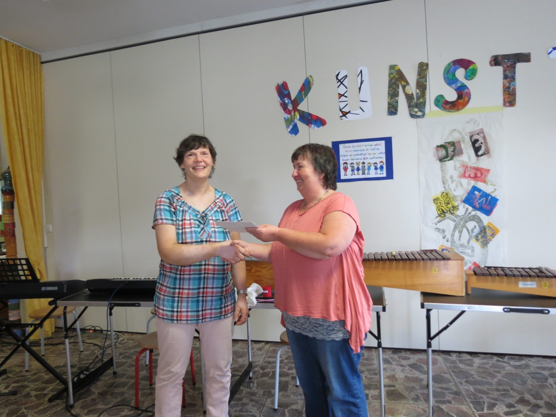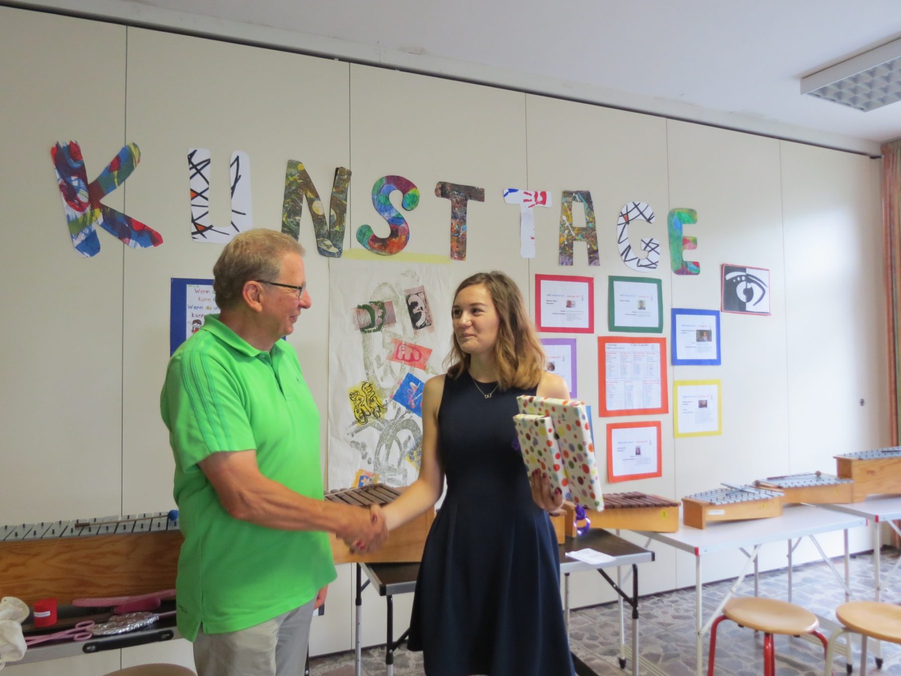 Die kleine Feierstunde wurde umrahmt von Vorführungen der Klassen. So gab die Grundstufe 1 den Entlass-Schülern die besten Wünsche in einem Lied mit auf den Weg. Umrahmt wurde der Vormittag mit Instrumentalstücken der Orffrockgruppe. Die Gitarrengruppe unter Leitung von Albert Heizmann präsentierte zwei Gitarrenstücke. Die bisherige Schulsprecherin Leonie Janka überraschte mit einem Lied, begleitet von Matthias Demmel am Piano. Die Entlassschüler Dominic Birr und Jannik Kaltenbach verabschiedeten sich unterstützt von ihrem Schlagzeuglehrer Klaus Zillhardt mit einem Auftritt an der »Schießbude«. Nicht fehlen dürfen die Jonglierkünste des schuleigenen Zirkus Karambolage.