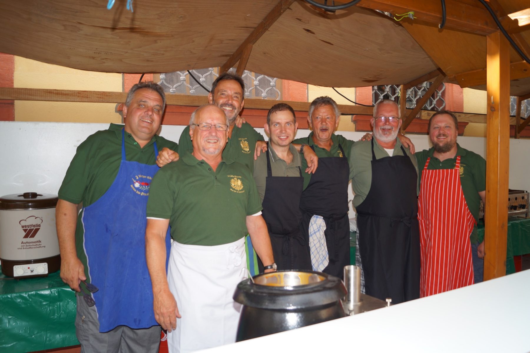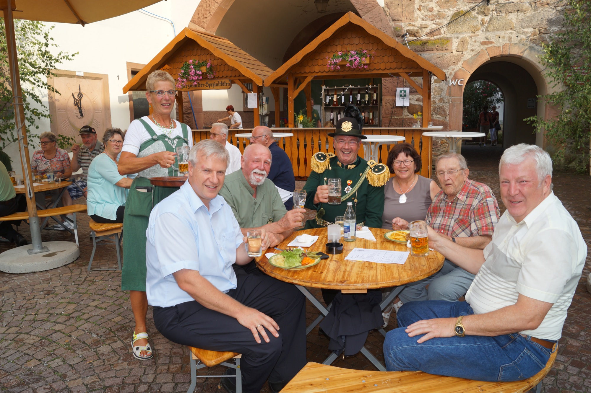 Die Trachtenfrauen, immer mit einem Lächeln, begrüßten die Gäste und übernahmen für sie den Service. Schnell, ansprechend angerichtet und lecker wurden Getränke und Speisen, vom Schaschlik-Teller mit Pommes bis zur Salatplatte mit Schnitzelstreifen, gebracht. Die Grundlage für den reibungslosen und prompten Service schufen viele Frauen und Männer in Grün hinter den Theken. Jeder an seiner Stelle beherrschte die Handgriffe und – für die Gäste deutlich zu spüren – hatte auch Spaß dabei.