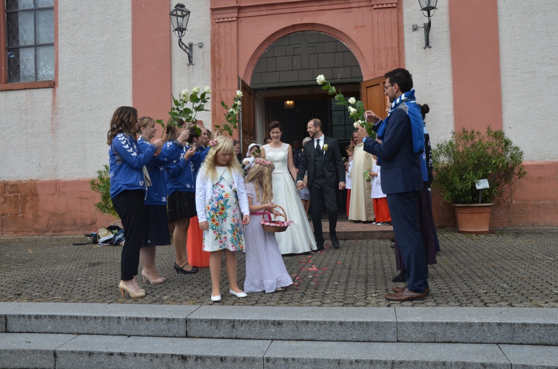 An die feierliche Stunde stellten die Handballerinnen des FVUs mit weißen Rosen vor dem Kirchenportal ein Spalier. Ihre Mannschaftskollegin Christina und ihren Ehemann Martin nahmen sie, wie auf dem Spielfeld, in die Mitte und überbrachten gemeinsam mit den ehemaligen Trainern Marcel Slota und Philipp Schwarz die besten Wünsche zum Start ins Eheglück.