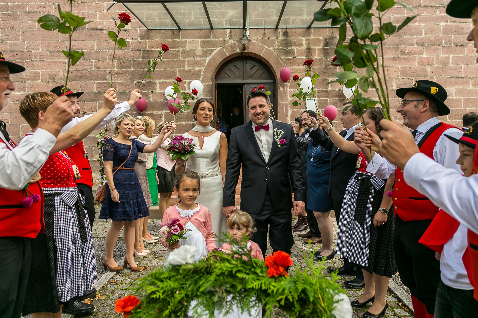 Am Samstag wurde in der St. Jakobus-Kirche in Stegen-Eschbach Hochzeit gefeiert. Nach der feierlichen Trauung begrüßten die Neuhausner Most-Maidle und Most-Buben und die Stegener Waldgeister das frisch vermählte Paar mit einem Spalier und roten Rosen im Eheglück.