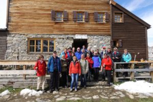 In der Höhe hatte es ca. 15 cm geschneit in der Nacht. Nach dem Frühstück hat Jürgen, unser Wanderführer aus Lech, die heutige Wanderroute zur Stuttgarter Hütte erklärt. Die »Entschlosseneren« Wanderer haben an diesem Tag die große Bergtour mit Jürgen gemacht. Mit der Rüfi-Seilbahn ging es zunächst auf die Rüfi-Bergstation auf 2362m. Der größte Teil der Wanderung führte durch frischen Schnee. Eine herrliche Sicht und atemberaubende Aussichten waren der Lohn für den Aufstieg. Murmeltiere mit ihrem sichtlichen Winterspeck kündigten durch lautes Pfeifen unsere Wandergruppe an. Auch Steinböcke waren zu sehen. Jürgen, der Wanderführer, war eine unermüdliche Quelle von Wissen über die Landschaft, Pflanzen und Tiere und natürlich auch über die Geschichte der Region. Es war strahlendblauer Himmel und ein Bombenwetter. In der Stuttgarter Hütte auf 2520m war Einkehr. Steil bergab in Serpentinen war der verschneite Weg beim Abstieg, hier war absolute Trittsicherheit verlangt.