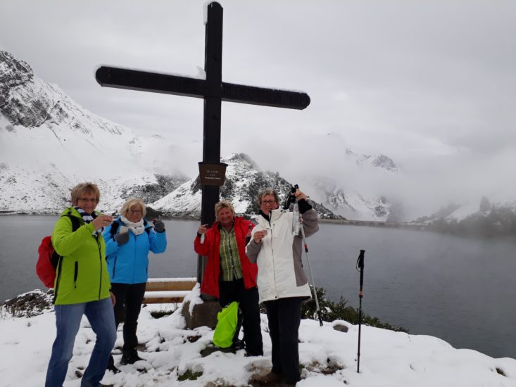 Auf der Passhöhe, fünf Minuten vor der Ravensburger Hütte, kam die Sonne wieder heraus, wo auch der Gipfelschnaps mit Entersbacher Willi zelebriert wurde. Kaum wurde die Ravensburger Hütte in der Sonne am Hang gesichtet, trafen auch die »Leichtwanderer« ein. perfektes Timing. Fast auf die Minute genau trafen sich beide Gruppen gemeinsam vor der Ravensburger Hütte, wo wir zusammen gegessen haben. Die Leichtwanderer kamen vom Spullersee. Der Spullersee wurde umrundet und mit einem Anstieg nach ca. eineinhalb Stunden ebenfalls der Treffpunkt, die Ravensburger Hütte, erreicht. Gemeinsam ging es wieder zurück, am Spullersee vorbei und den Rest nach Lech mit dem Wanderbus.