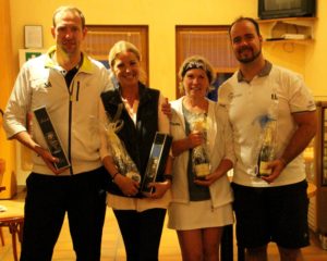 Sportwart Emanuel Lehmann überreichte den glücklichen Siegern und Platzierten Champagner und Rotwein statt der üblichen Pokale. Für seine eigenen Clubmeistertitel im Einzel und Mixed konnte er sich selbst ehren. Er bedankte sich für die rege Beteiligung und die fairen Spiele. Eine Neuerung hatte der Sportwart und Turnierleiter auch noch parat. Er präsentierte Holztafeln, auf denen Jahr für Jahr die Clubmeister verewigt werden sollen. Diese Tafeln sollen einen Ehrenplatz im Clubhaus erhalten.