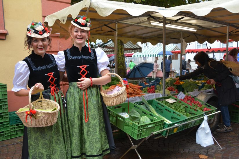 »Der Wochenmarkt hat sich gut entwickelt«, bestätigt Marktfrau Elisabeth Börsig. Seit 32 Jahren bietet die Familie Börsig jeden Samstag ihre Hofprodukte auf dem Zeller Markt an und vertreibt auch Produkte von benachbarten Höfen. Landwirtschaftliche Erzeugnisse gehören traditionell zum Hauptangebot auf dem Städtlemarkt. Aber auch viele andere Produkte locken regelmäßig die Kunden auf den Kanzleiplatz. Beim Jubiläums-Städtlemarkt am Samstag war das Angebot noch etwas reichhaltiger als sonst. Als Dankeschön für ihre Treue zum Markt übergaben Maria Hättich und Alisa Dörfer vom Zeller Stadtmarketing den Marktbeschickern ein »Storchenturm«-Tröpfle.