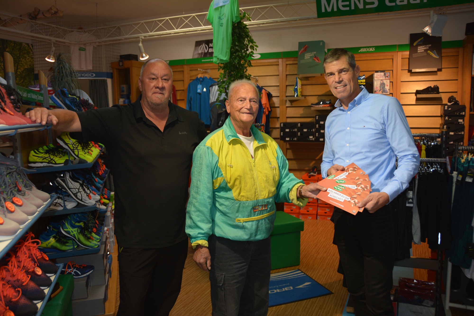 »Die Flüchtlinge im ZFV sind integriert und akzeptiert«, betont ZFV-Vorstand Christian Pristl (rechts). Schon seit mehreren Jahren spielen sie erfolgreich im Verein und Gibbi Bah ist in der laufenden Saison zum besten Torschützen der 1. Mannschaft geworden. Damit die Aufnahme der Flüchtlinge im Verein noch besser gelingt, haben Seniorchef Willi Beck (Mitte) und Walter Beck (links) von Sport-Beck den Zeller Fußballverein mit einer Spende unterstützt. Im Sportfachgeschäft in der Turmstraße können sich die jungen Fußballer mit dem notwendigen Zubehör ausstatten.