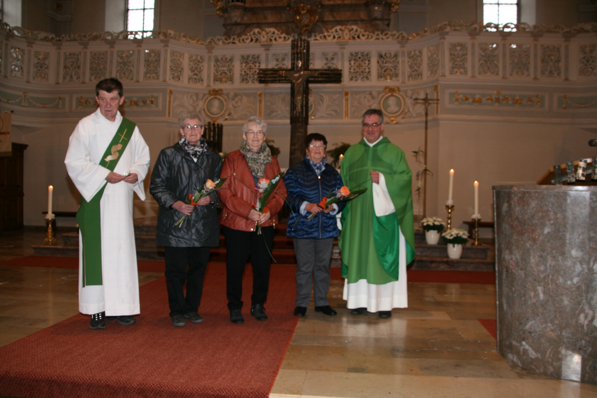 Bruder Pirmin (links) und Pfarrer Gerner mit der amtierenden Vorsitzenden der Kath. Frauengemeinschaft Agnes Beeh (2. von rechts) und den früheren Vorsitzenden Rosa-Maria Uhl und Gertrud Krieg (von links).