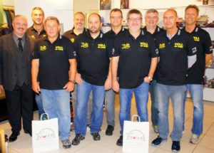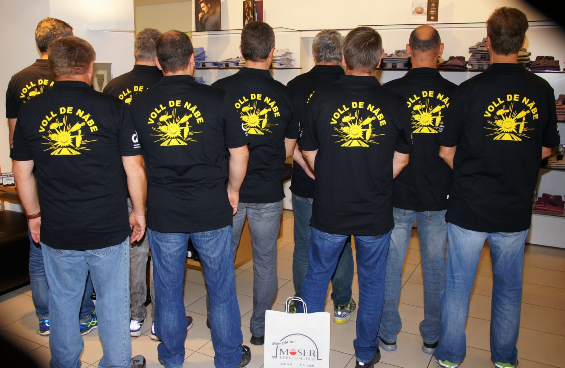 Seit 36 Jahren besteht der Kegelclub »Voll de näbe« und trifft sich 14-tägig, um neben der sportlichen Herausforderung auch die Kameradschaft zu pflegen. Da die bisherigen Keglershirts schon ein bisschen »aus der Form« gekommen sind, freuten sich die Kegler umso mehr, aus den Händen ihrer Sponsoren die neue Sportkleidung entgegenzunehmen. Für die Unterstützung sagen die Kegler ein »Herzliches Vergelt’s Gott«. Die Mitglieder des Kegelclubs »Voll de näbe« mit den Sponsoren Konrad Moser (1. von links), Andreas Damm (2. von links) und Alexander Harter (4. von links).