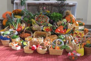 Das Zeller Gemeindeteam hat den schönen Erntedankaltar im Altarraum aufgebaut. Freiwillige Helferinnen haben mit Erntegaben und Dekorationsmaterial geholfen. Viele große und kleine Kürbisse, Kartoffeln, Sellerie und Karotten, Weintrauben und Äpfel, Nüsse und Maiskolben, Blumen und Salatköpfe – der Herbst ist die Zeit der Ernte. Der Erntedankaltar bleibt bis Dienstagabend in der Kirche; dann müssen die verderblichen Lebensmittel abgeräumt werden.