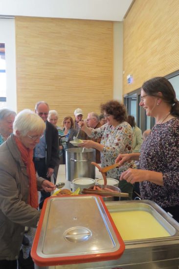 Der Einladung zum Mittagessen im Pfarrheim folgten ca. 100 Gemeindemitglieder. Dass die Kartoffelsuppe, gekocht von der Küche des Seniorenheims St. Gallus, sehr gut schmeckt – wussten die Besucher noch von den beiden Jahren zuvor. Das Gemeindeteam hat das Essen organisiert, dessen Erlös ebenfalls für Sr. Patricia und die Kapuzinermission bestimmt ist.
