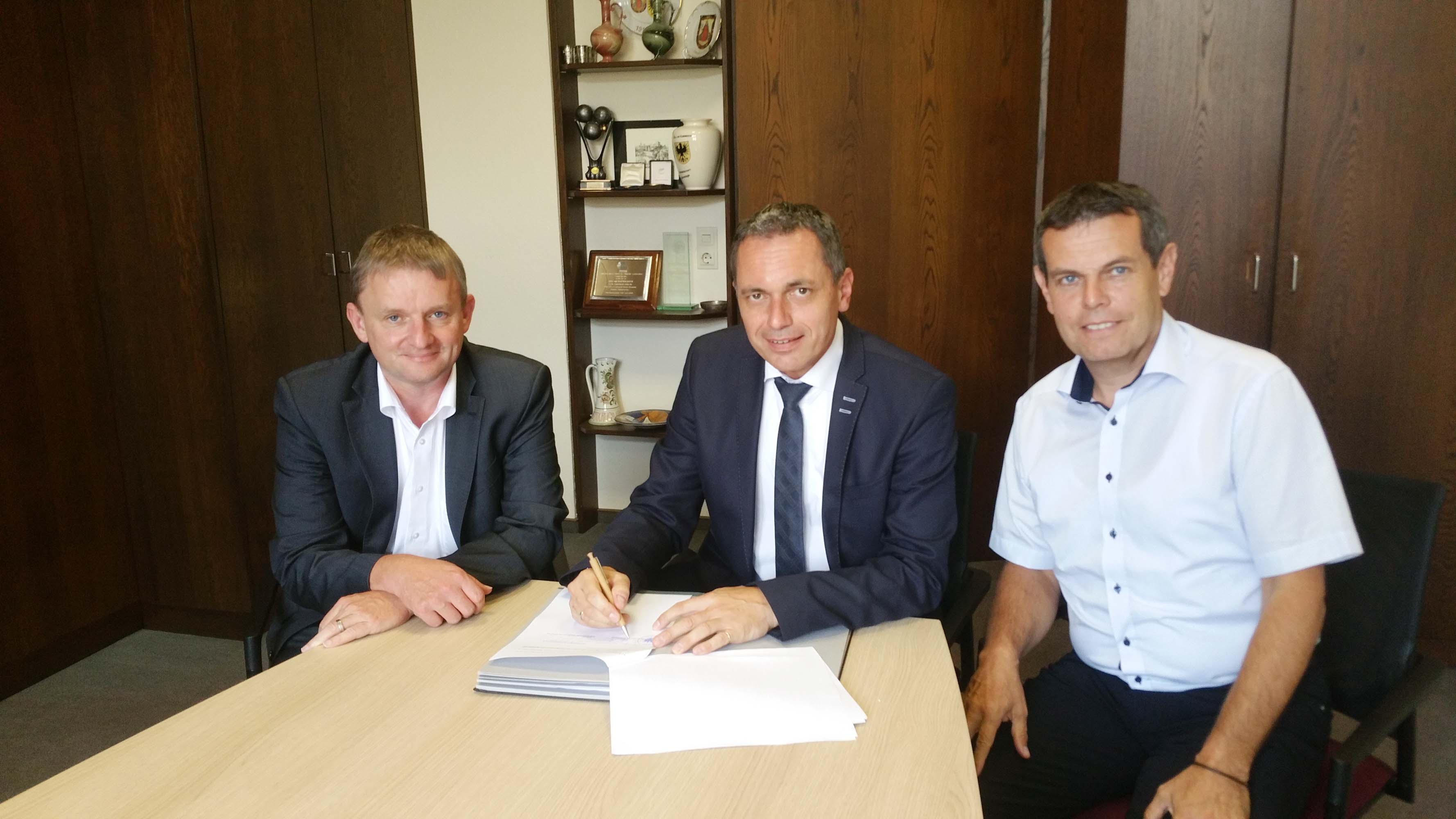 Martin Wenz, Leiter Unternehmenssteuerung im E-Werk Mittelbaden, Bürgermeister Pfundstein und Lothar Baier, Netze Mittelbaden (von links nach rechts) bei der Vertragsunterzeichnung. Foto: Unternehmen