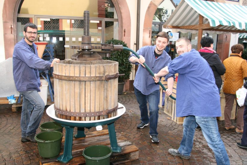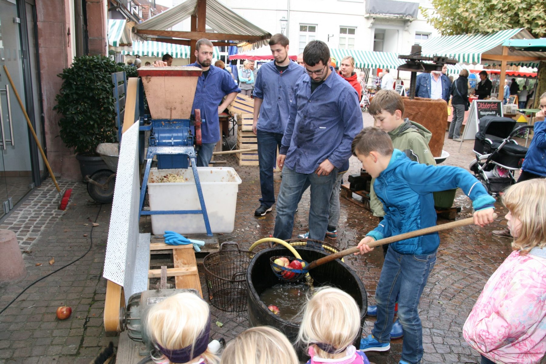 Die rotbackigen Früchte wurden unter den Augen der interessierten Marktbesucher zunächst in einem Bottich gewaschen. Kinder, die den Apfelsaft nur vom Supermarkt kennen, standen besonders neugierig um die hantierenden Mostbueben herum. Sie durften beim Waschen auch mit Hand anlegen. Danach kamen die Äpfel in die Mühle und im Anschluss in die Trotte. Jetzt war die Muskelkraft der jungen Freizeitbauern gefragt. Zwar hätte eine hydraulische Presse noch mehr aus dem Mahlgut herausgeholt, aber das Ergebnis wäre dann nicht so süß und fruchtig ausgefallen.