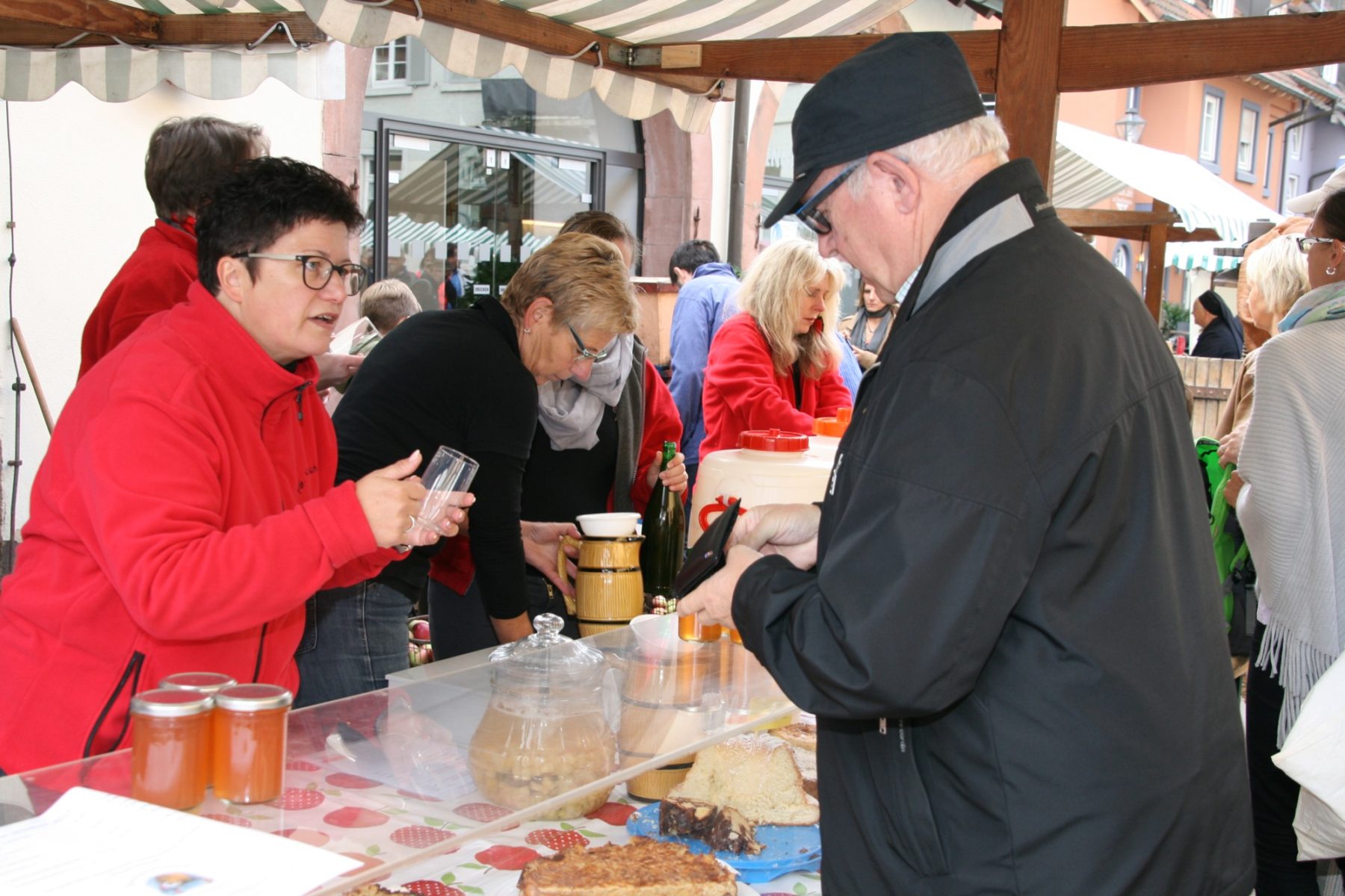Am Mark-Stand neben der Trotte schenkten die Mostmaidle den frisch gepressten Saft an die Besucher aus oder füllten ihn zum Verkauf in Flaschen ab. Die Theke mit den selbstgebackenen Kuchen verlockte, das ein oder andere Stück gleich an einem Stehtisch zu verzehren oder sich für den Nachmittags-Kaffee zuhause einpacken zu lassen.