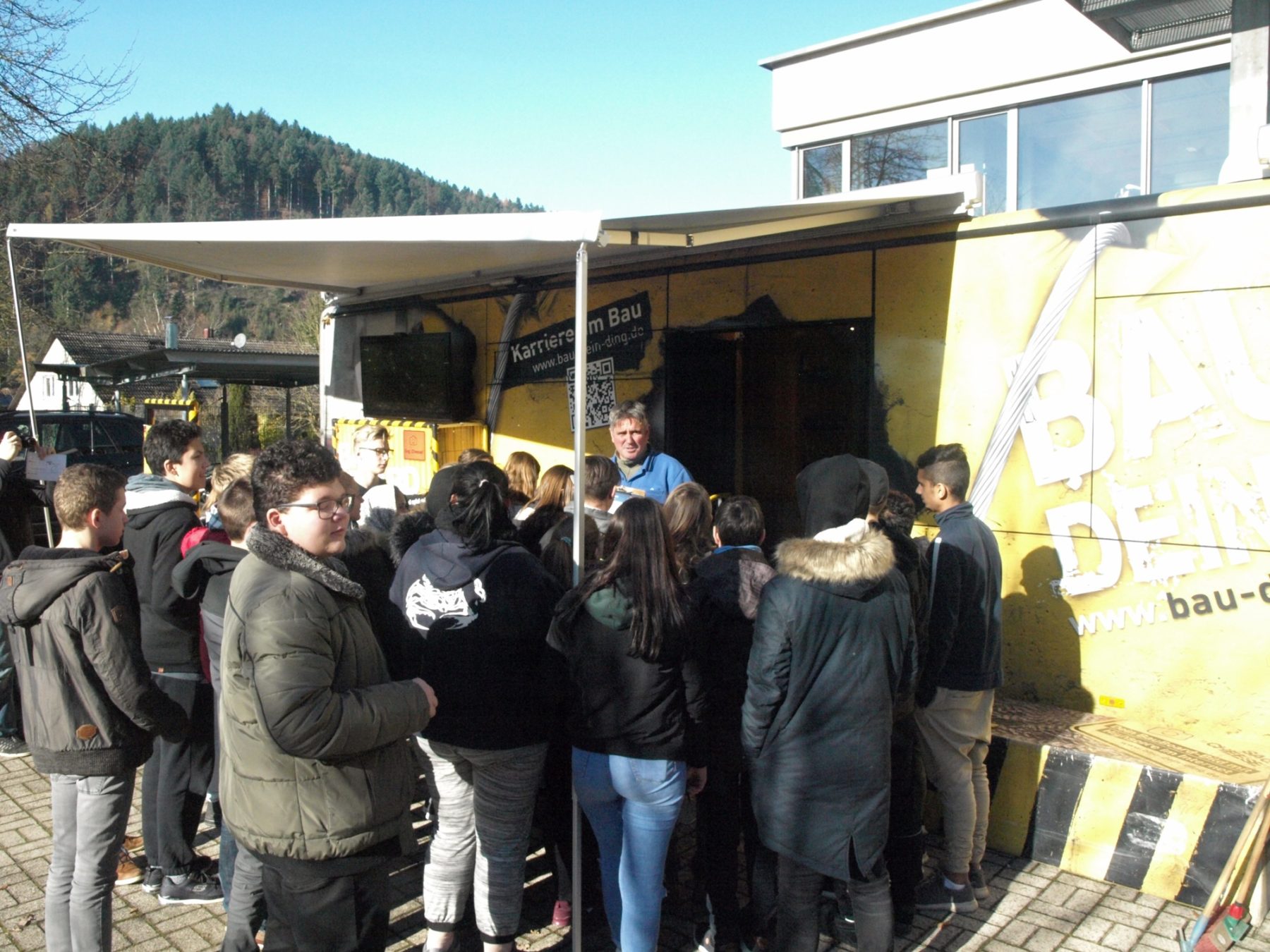 Neben dem Straßenbauunternehmen Knäble waren die Zimmerei Rombach (Oberharmersbach), das Bauunternehmen Grafmüller (Zell a. H.) und Hoch-Baumaschinen (Steinach) eingeladen, im Foyer des Schulgebäudes ihre Informationsstände aufzubauen. Auch der BauBus steuerte an diesem Tag das Bildungszentrum an. Der multimedial ausgebaute Linienbus ist für die Nachwuchskampagne der Bauwirtschaft Baden-Württemberg von Schule zu Schule auf Tour und präsentiert interessierten Klassen anschaulich die zahlreichen Berufe am Bau. In Zweierteams wurden die Jugendlichen losgeschickt und mussten verschiedene bauhandwerkliche Aufgaben lösen. Auf spielerische Weise wurden sie so an über 20 Bauberufe herangeführt und konnten aktiv ausprobieren, ob sie dafür die notwendigen Fähigkeiten besitzen. Neben dem praktischen Teil gab es einen kurzen Vortrag über die Ausbildung in der Bauwirtschaft. Zum Auftakt der Veranstaltung stellte Hannes Grafmüller den Schülerinnen und Schülern die verschiedenen Ausbildungsmöglichkeiten