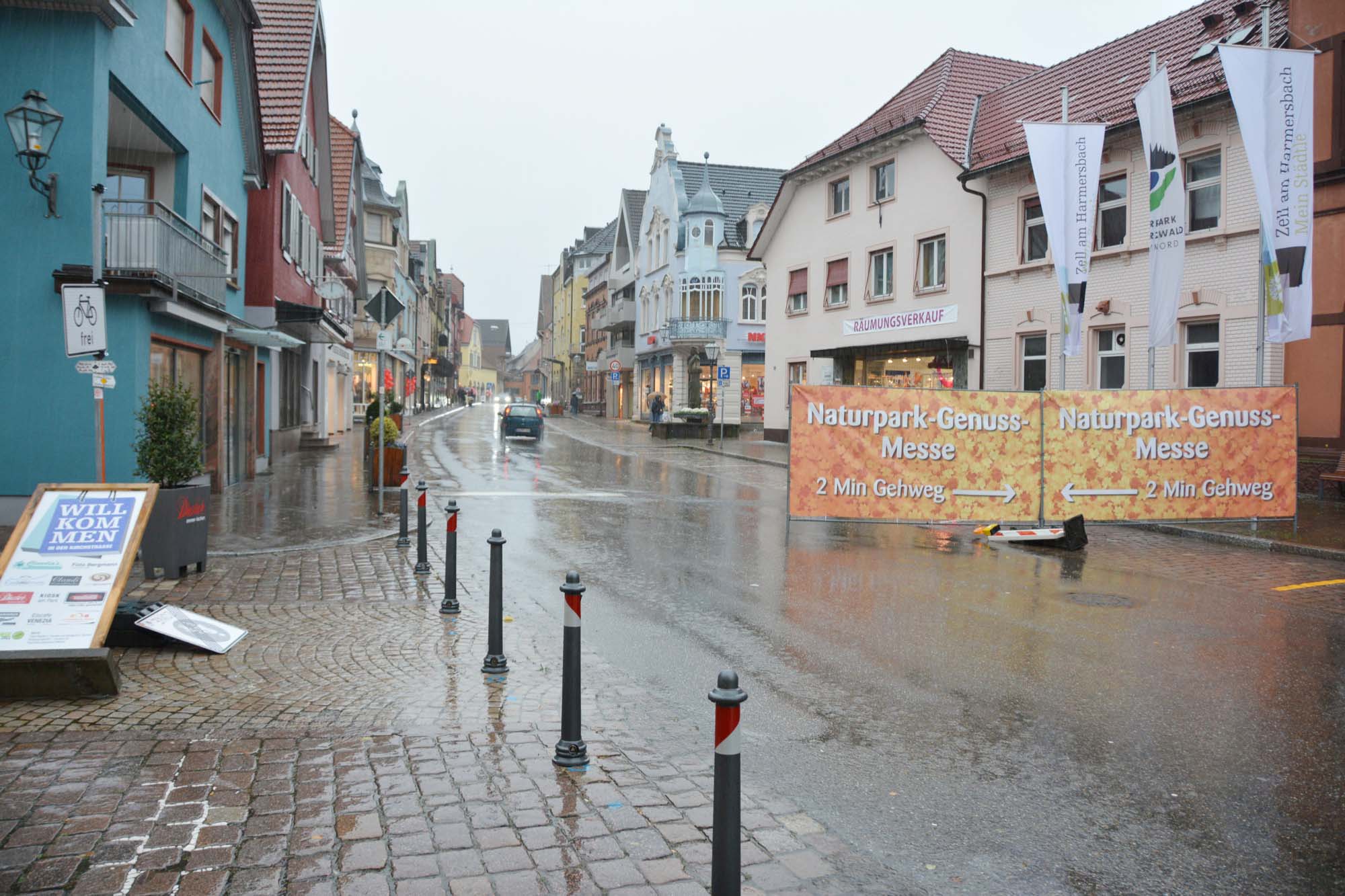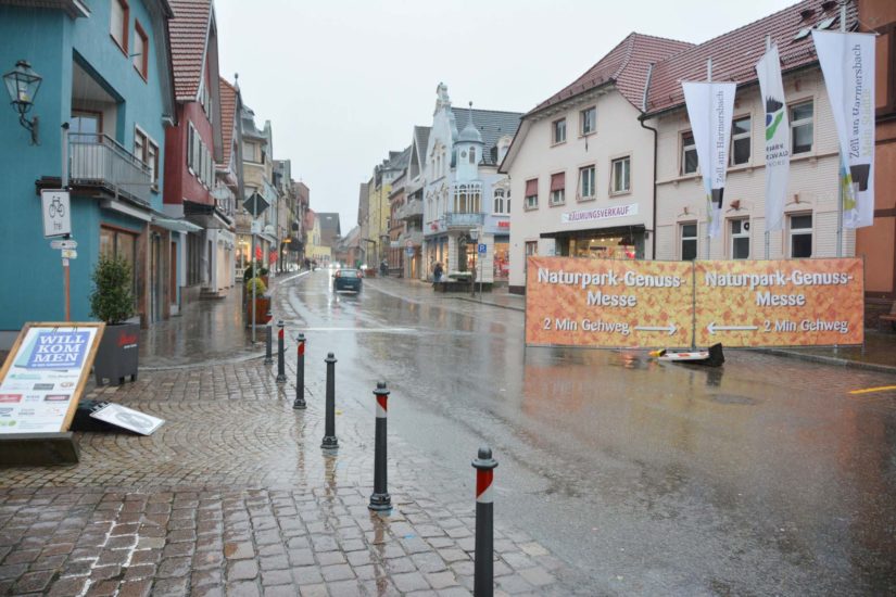 So etwas hat es an einem verkaufsoffenen Sonntag in Zell noch nie gegeben: Nach dem Gewittersturm um 14 Uhr war die Hauptstraße leergefegt. Schilder waren durcheinander gewirbelt. Die wenigen Sonntagsbummler waren in die Geschäfte, die Restaurants und in die beiden Veranstaltungshallen geflüchtete. Foto: Hanspeter Schwendemann
