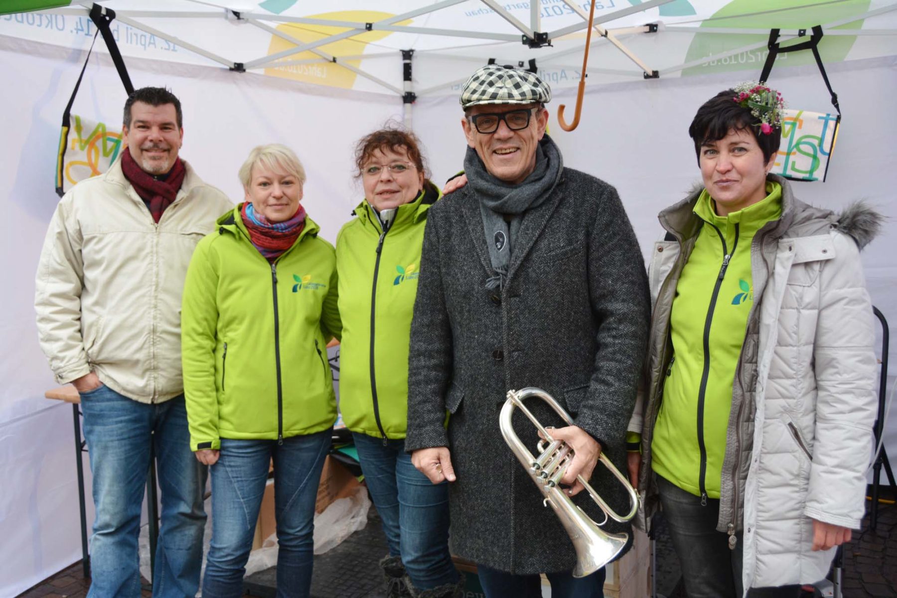Am Samstag warben die Damen am Aktionsstand auf dem Kanzleiplatz für die Landesgartenschau 2018 in Lahr und verkauften Dauerkarten. Die beiden Musiker Hämme Dold (2. von rechts) und Philipp Moehrke (links) trotzen mit schwungvoller Musik und guter Laune dem Dauerregen.