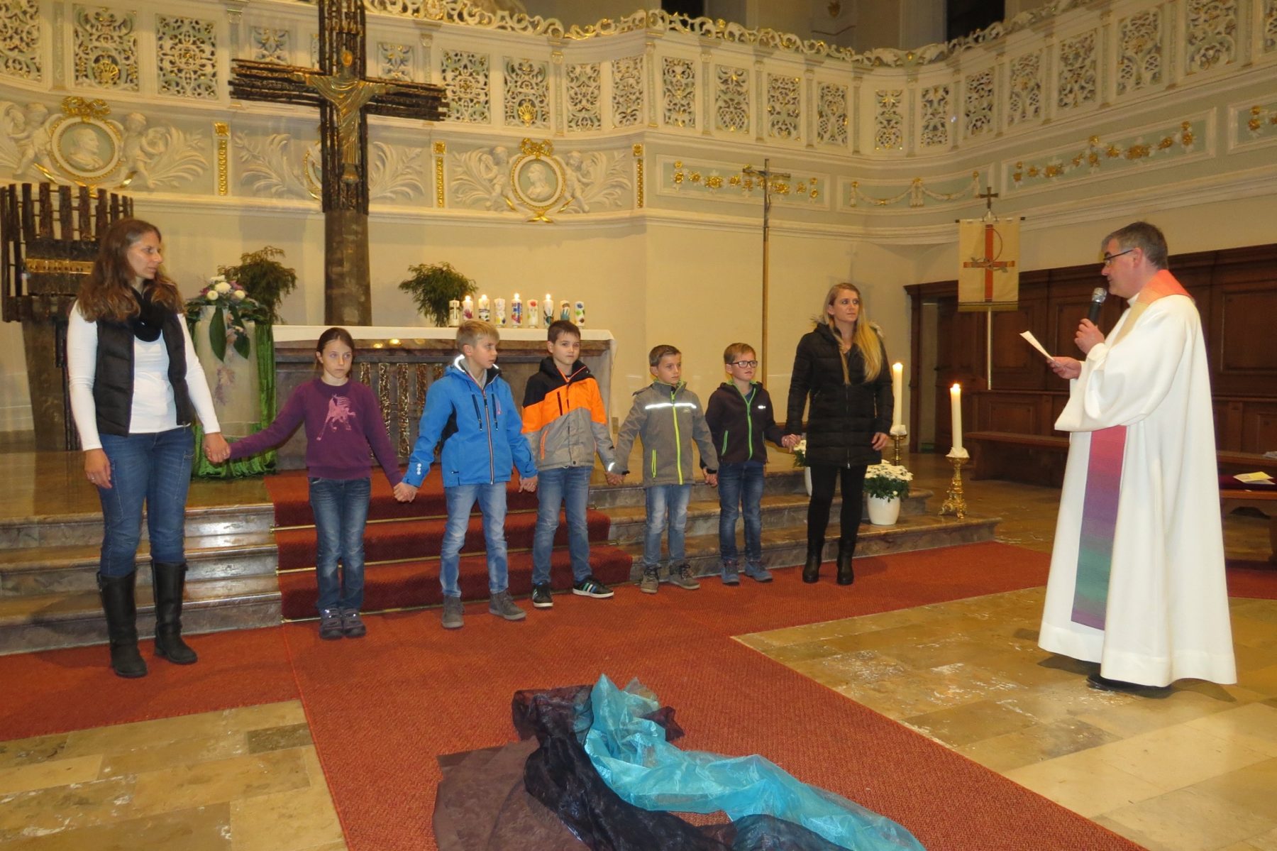 Zum Gebet »Vater unser« lud Pfarrer Gerner alle Kinder ein, sich in einem großen Kreis um den Altar zu stellen. Hand in Hand wurde das zentrale Gebet der Christen gemeinsam esprochen.