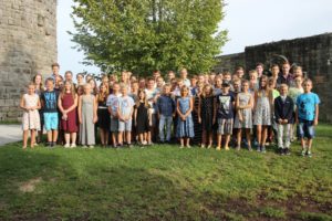 Pfarrer Gerner besuchte die Gruppe für zwei Tage. Gemeinsam wurde ein Lagergottesdienst zum Thema Freundschaft vorbereitet, der bei schönem Wetter im Hof des Schlosses unter schattenspendenden Bäumen gefeiert wurde.