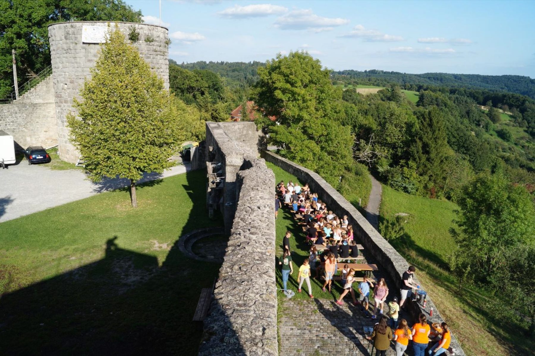 Die Umgebung des Schlosses wurde bei verschiedenen Aktionen und Ausflügen erkundet. Vom Schloss zur Bushaltestelle in Auenwald verlief ein kleiner Pfad mit über 300 Stufen durch den Wald. Mit dem Bus ging es in der ersten Woche zur Kletterhalle, in der die Kinder in schwindelerregende Höhen kletterten. Als Belohnung für den anstrengenden Aufstieg konnte man sich in Gipfelbücher eintragen oder mit Lichtern und Glocken allen verkünden, dass man es nach ganz oben geschafft hatte.