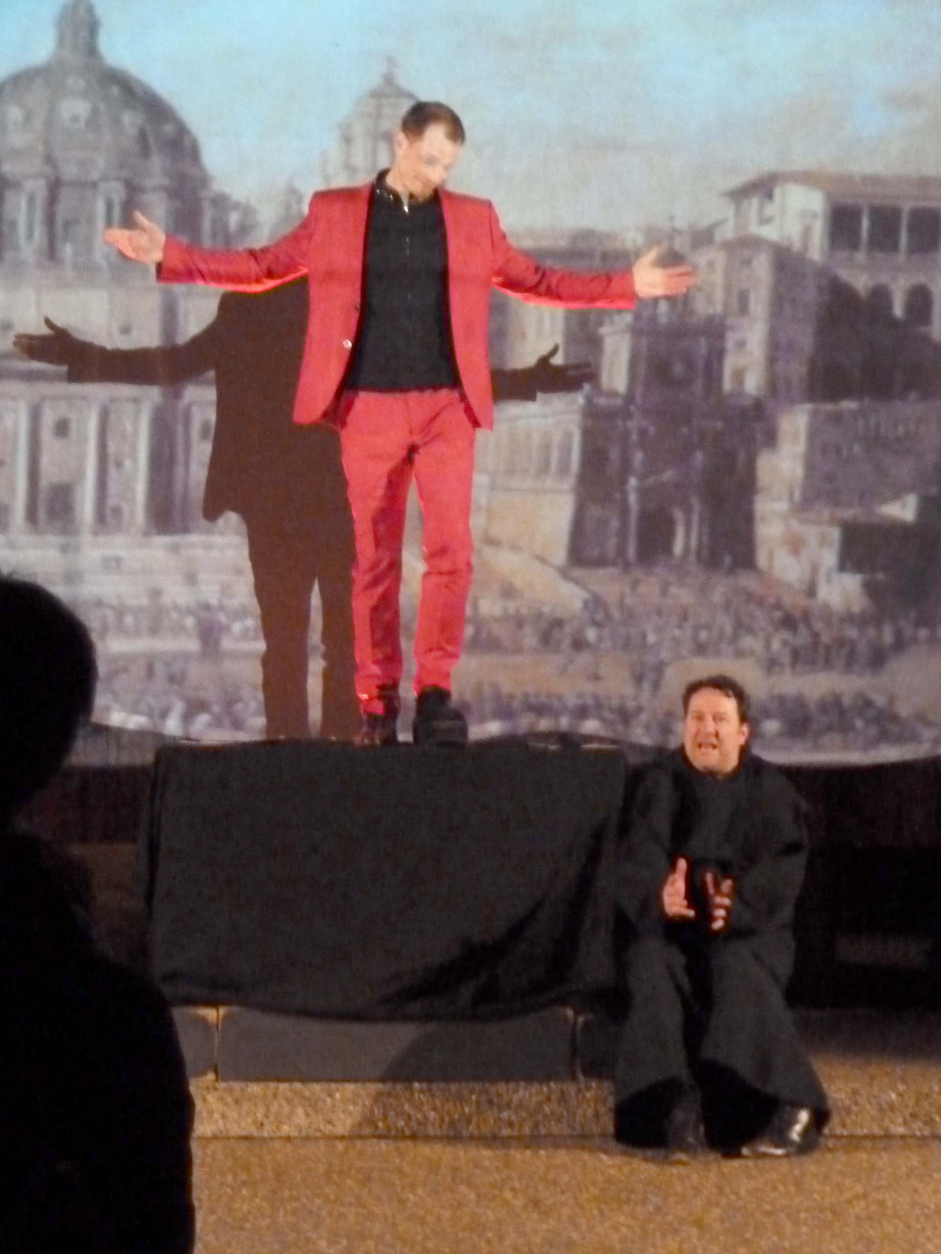 Anzug mit schwarzbeschuhtem Klumpfuß den personifizierten Beelzebub. Dem intriganten Mephisto in Goethes »Faust« vergleichbar, begleitet Belial den Reformator mit Spott und Häme und verstört selbst das Publikum mit seinem Furor. Auf dem Reichstag zu Worms, wo Luther sich vor Kaiser und Kardinälen rechtfertigen muss und seine Thesen widerrufen soll, werden die Zuschauer in die Handlung einbezogen, gespalten in die Fraktion der Anhänger bzw. der Gegner des Reformators.