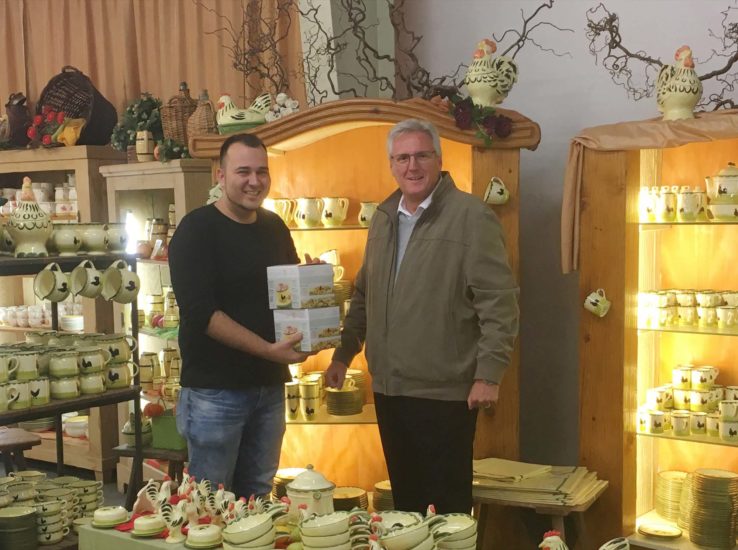 Den 1. Preis, ein vierteiliges Hahn- und Henne Cappuccino-Set, bestehend aus vier Ober- und vier Untertassen der Zeller Keramik, bekam Patrick Schuler durch John Großpietsch, Initiator des Gewinnspieles überreicht.