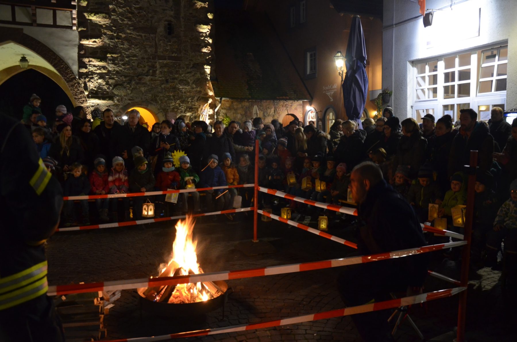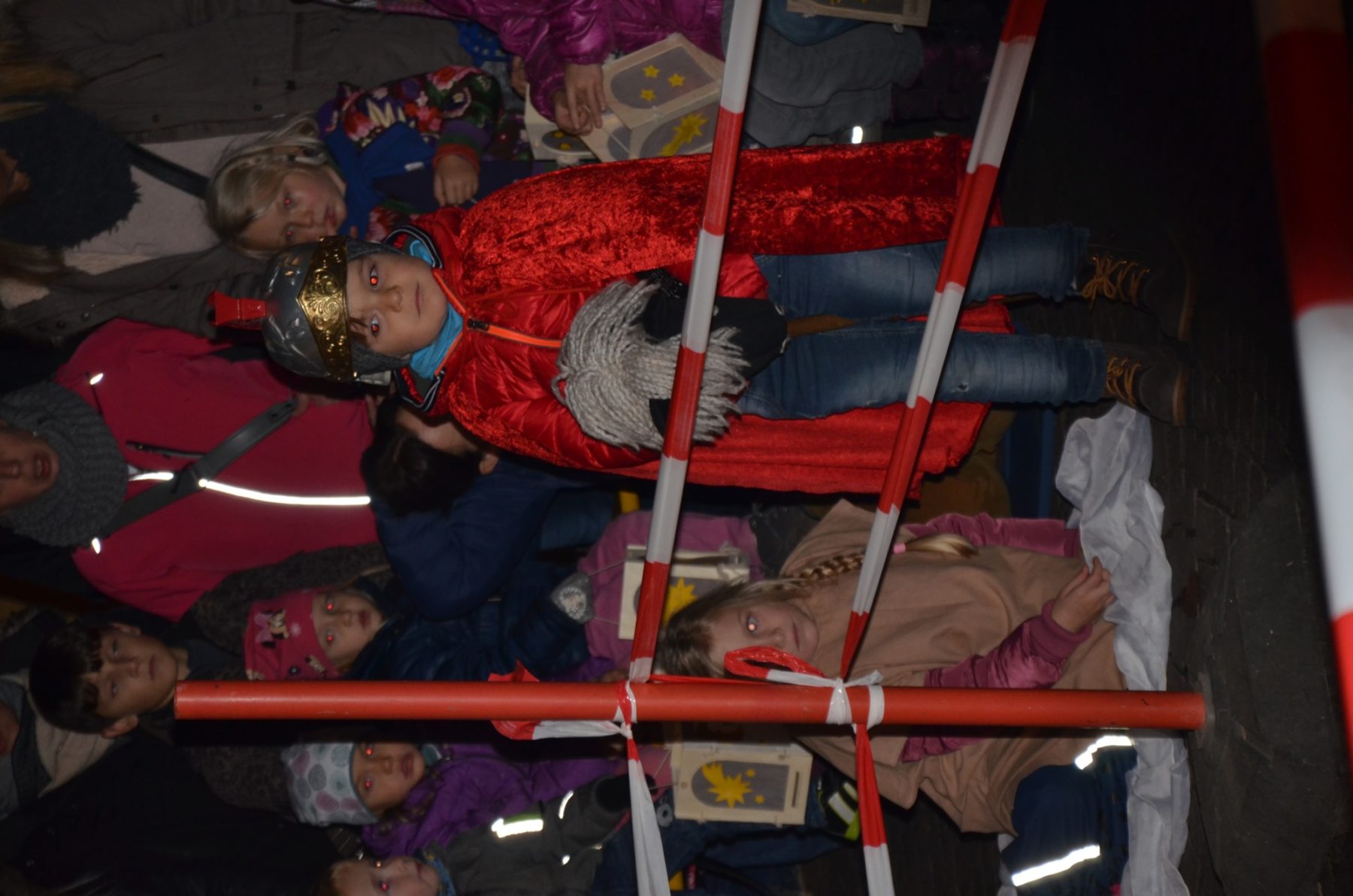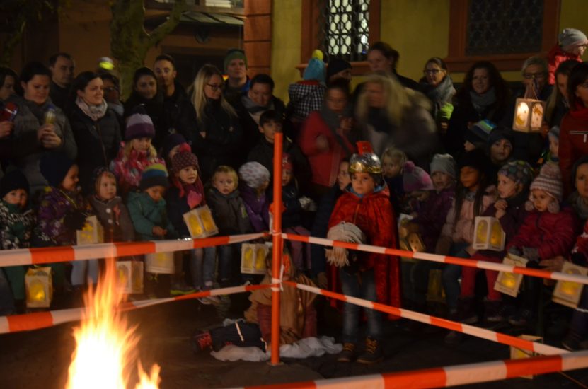Am späten Nachmittag zogen viele kleine Laternenträger von dort im größeren Bogen zum Kanzleiplatz. Den Zug führte Christina Pfundstein als Heilige Martina auf Wallach Dario an. Der Vater von Christina Pfundstein, Hubert Hansmann, begleitete Tochter und Ross.