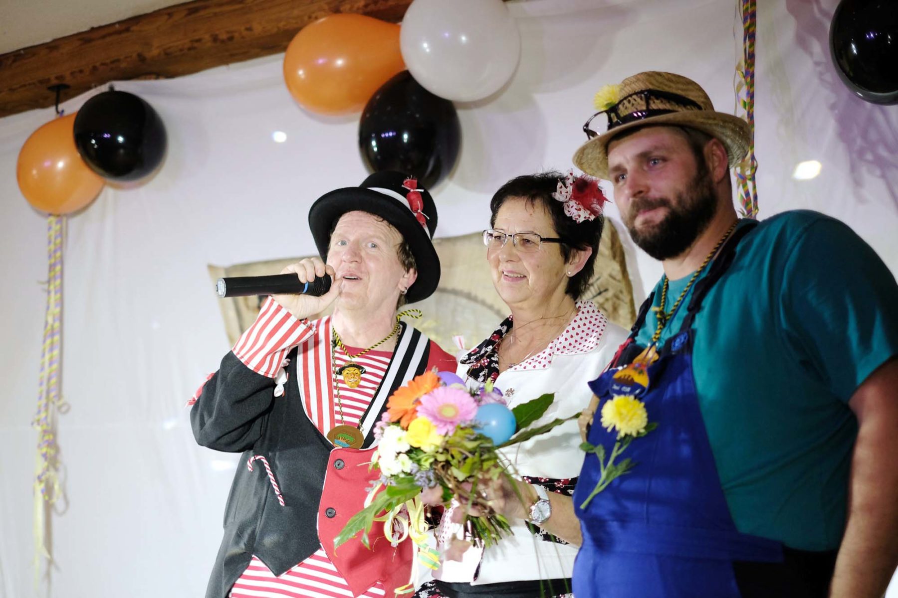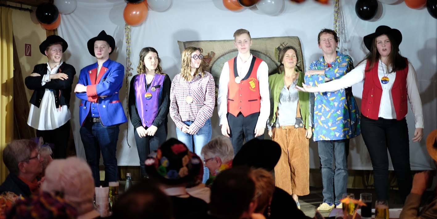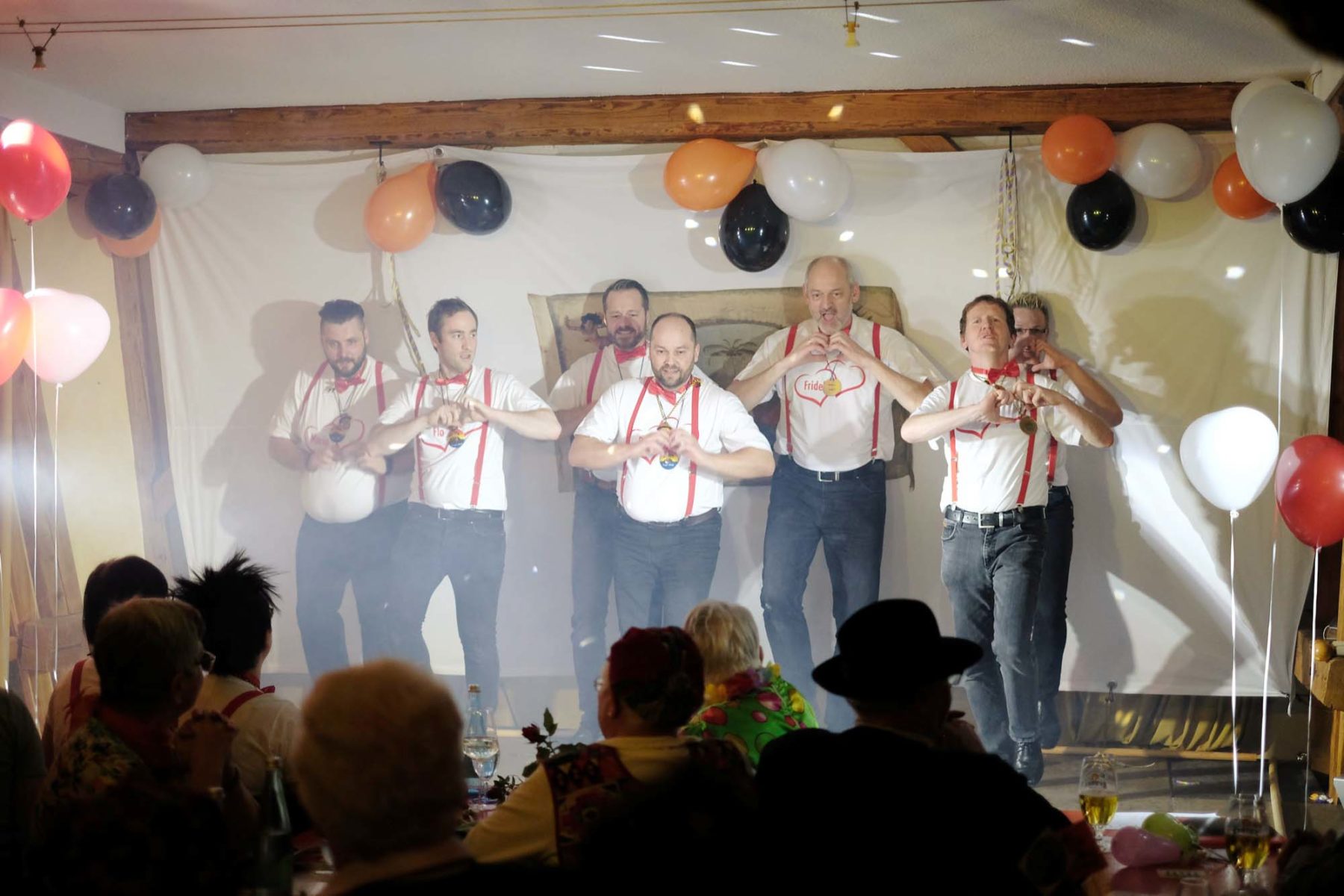 Nach dem offiziellen Teil startete das Jubiläumsprogramm mit »Emotions hoch 8« – einer satirischen Sprechcanon-Nummer, die die Führungsriege der anderen Fasendsver­einigungen auf die Schippe nahm. Wieder mit dabei waren auch Chantal und ihre Petticoats. Mit deftigen Sprüchen und ebensolchen Liedern nahmen sie kein Blatt vor den Mund. Sie plauderten und sangen anzüglich über den nun wieder »freien Verkehr in der Kirchstraße«, stellten fest, dass das mit der Behelfs-Bushaltestelle an der Schule gar nicht so schlimm sei, weil die Jugend heute sowieso nur aufs Handy starrt und waren sich sicher, dass man aufgrund der Schilderdichte Zell am Harmersbach getrost bald in Zell am Schilderbach umbenennen könnte. Das Feuerwerksverbot in der Altstadt nahmen sie ebenfalls aufs Korn und sie fanden, dass zur Eindämmung des Vandalismus durchaus die Bürgerwehr zur Hilfe gerufen werden könnte.