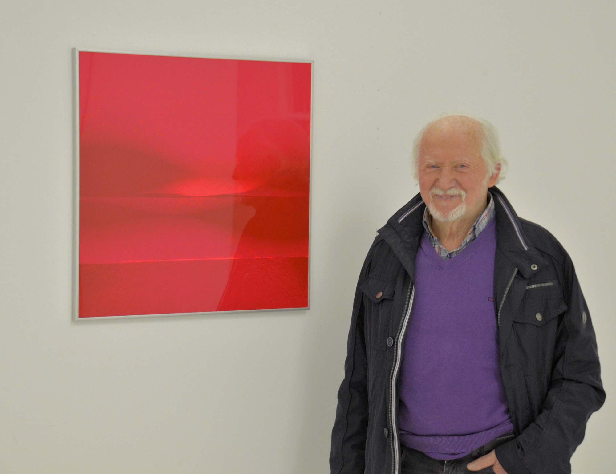 Galerist Walter Bischoff neben dem Bild »rot Schnee licht«, 2014, aus der aktuellen Sonder­­- aus­stellung mit Arbeiten von Sibylle Wagner. Foto: Gerhard Vaternahm