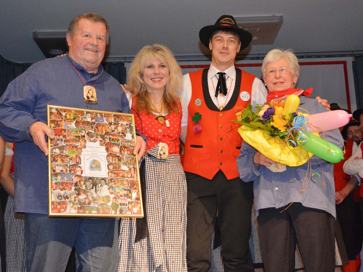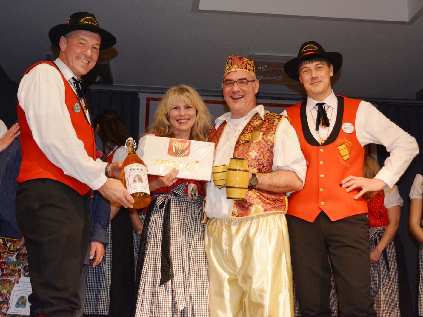 Foto: Hanspeter Schwendemann»31 wunderbare Jahre feierten wir im Kleebadsaal, jetzt ist die heilige Halle von St. Symphorian unsere erste Wahl«, lobte Gemeinschaftsführer Klaus Kienzle und strahlte gemeinsam mit seinen Mostbuebe und Mostmaidle beim Ausblick auf die ausverkauften Reihen. Ganz entspannt hatten dort auch Bärbel und Hans Heitzmann Platz genommen. »Von 1987 bis 2017 haben wir im Kleebad tolle Stunden und Nächte verbracht«, bedankte sich Klaus Kienzle und sprach diesen Dank auch im Namen seiner beiden Vorgänger Hubert Lehmann und Reinhard Harter aus. Als Geschenk überreichte er, gemeinsam mit seiner Frau Juana, Blumen und eine Fotocollage, die Bärbel und Hans Heitzmann an diese schöne Zeit erinnern soll. »Es waren 31 kameradschaftlich-närrische Jahre«, bestätigte auch Wirtin Bärbel Heitzmann.