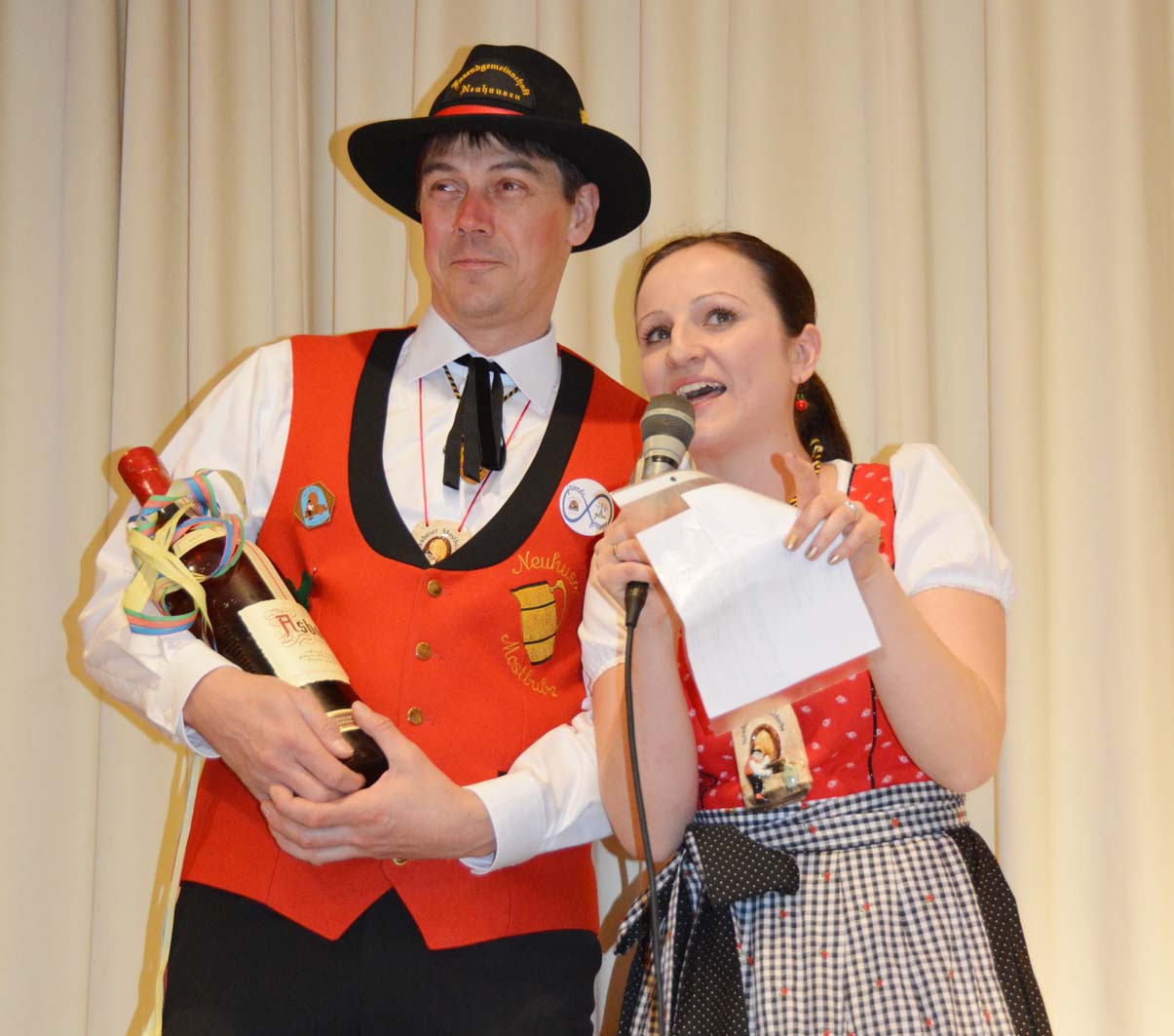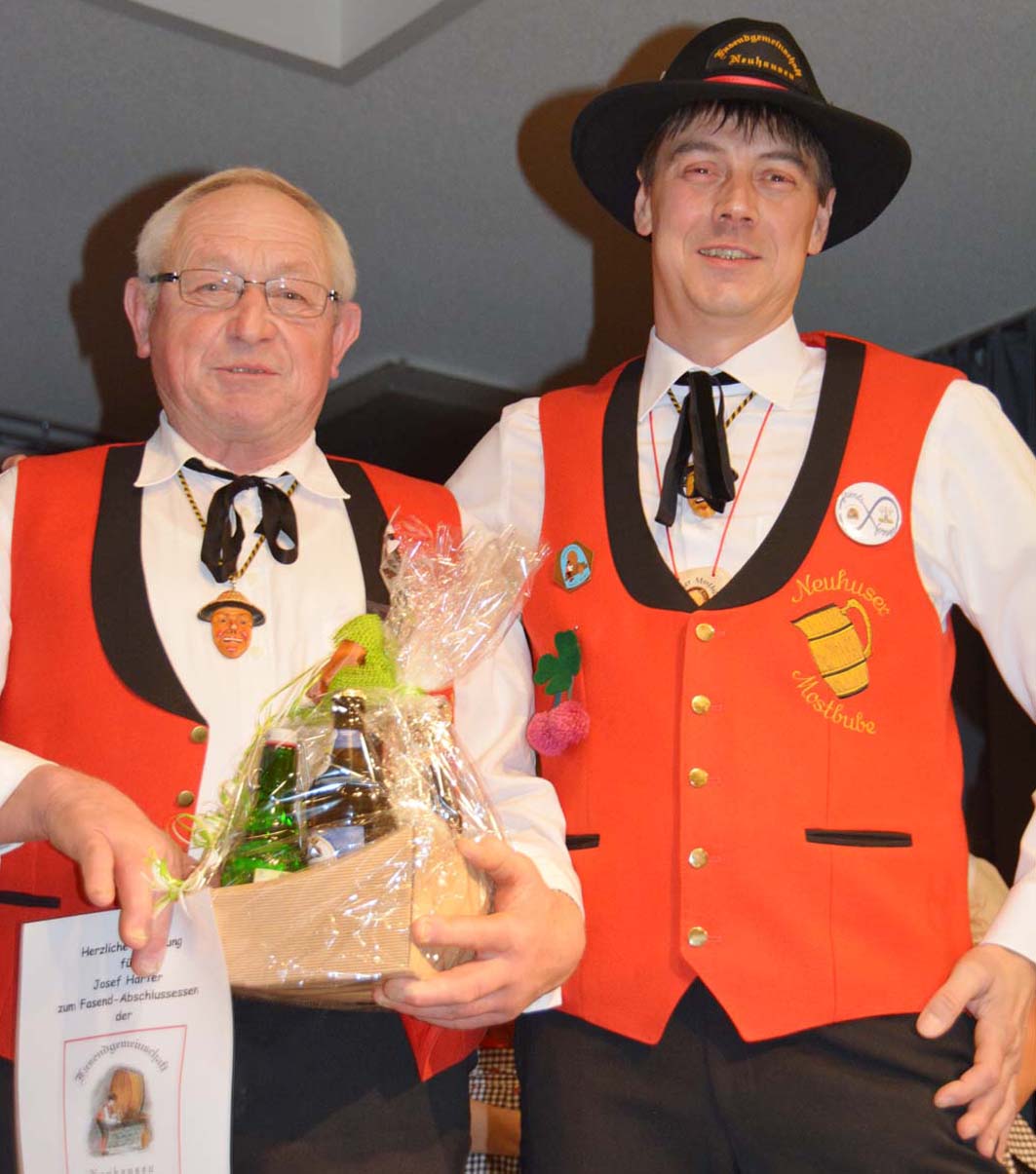 Dem Abschiedsgeschenk folgte der Willkommensgruß. Und der galt in Form eines kleinen Mostkrugs ans Revers, einem großen Mostkrug und den passenden Trinkbechern sowie obendrein mit einer Flasche »Neuhauser Edelmost 2017 Südhanglage« dem neuen Gastgeber und Pfarrer Bonaventura zusammen mit seinen Pfarrgemeinderäten. »Von mir aus dürft ihr die nächsten 31 Jahre hierbleiben«, hieß Pfarrer Gerner die närrischen Gäste willkommen und erhielt dafür den jubelnden Applaus aller Neuhauser Narren.