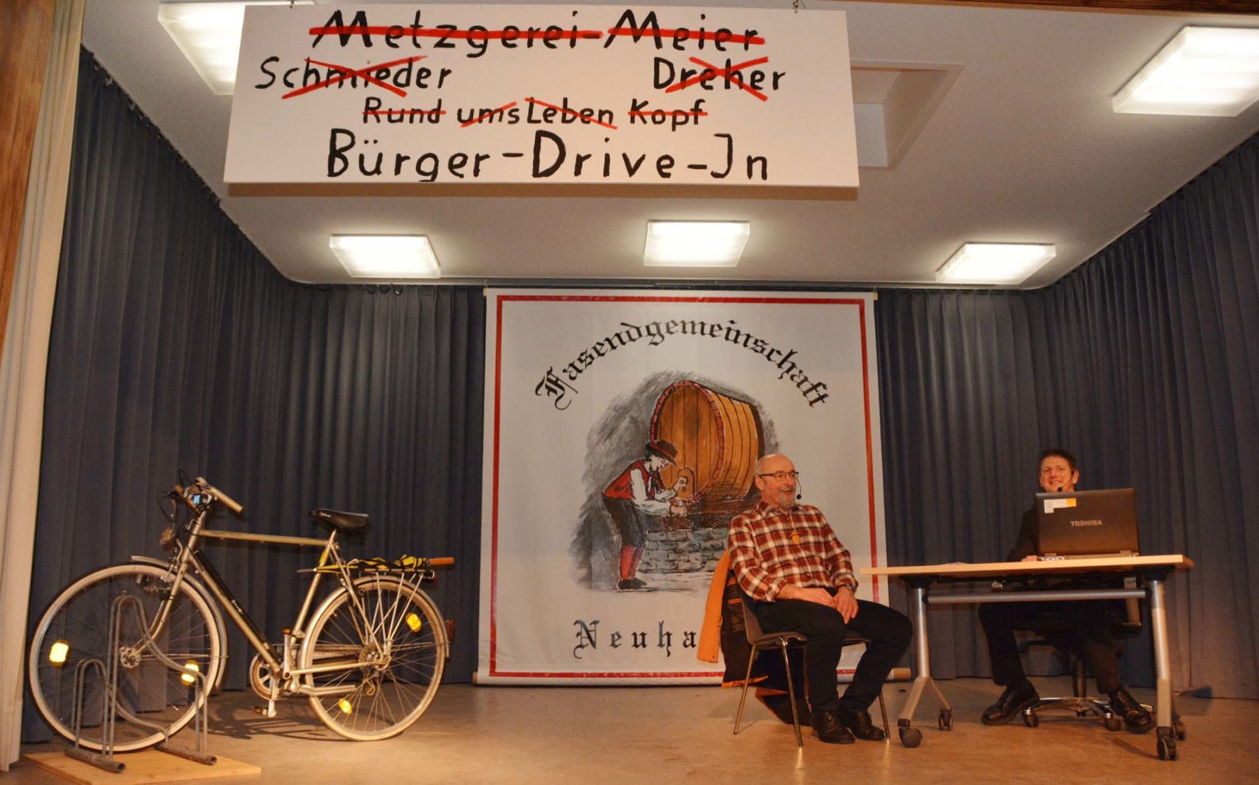 Im ersten »Bürger-Drive-In« trafen sich »Opa« Hubert Lehmann und Bürgermeister Günter Pfundstein. »Ich wollte eigentlich nur Wurst kaufen«, zeigte sich der eingefleischte Neuhauser Radfahrer zunächst verdutzt, ergriff dann aber doch die Gelegenheit, denn er wollte dem »Burger-Meister« schon immer Mal Bescheid sagen. »Wir bauen die Zukunft der Stadt« betonte der eine. »dm-Markt und Deo brauch ich nicht«, sagte der andere: »Ich mache langsam, bevor ich ins Schwitzen komm!« Auch, dass alles Geld in den Hombe fließt, war dem Opa aufgefallen: »Aber in den Neuhauser Wassertretstellen ist kein Wasser mehr?«