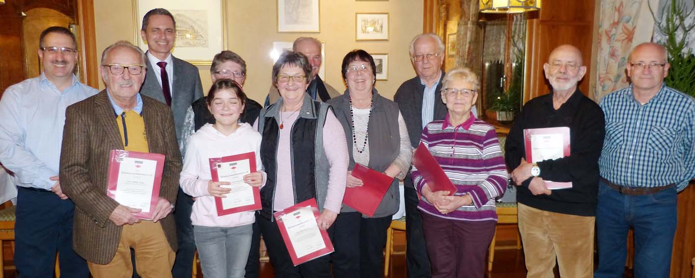 Für ihre Arbeit dankte der Vorsitzende seinen Vorstandskollegen, die sich unter der Federführung des Bürgermeisters denn auch einstimmig von den Anwesenden entlastet und in ihrem Amt bestätigt sahen. »Wir haben eine große Verantwortung für den Schwarzwald«, fasste Manfred Brosamer zusammen. »Jeder, der die Natur liebt, hat einen Grund für eine Mitgliedschaft im Schwarzwaldverein.« Umso mehr freute es ihn, dass 15 Mitglieder seit inzwischen 40 Jahren dem Verein ihre Treue halten, weitere neun erhielten eine Ehrung für eine seit einem Vierteljahrhundert währende Mitgliedschaft. »Wir brauchen Euch«, unterstrich der Vorsitzende und dankte jeweils mit einer Ehrenurkunde, der Ehrennadel sowie einem Weinpräsent.