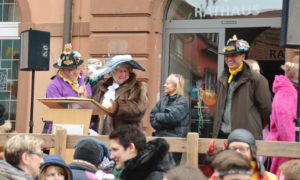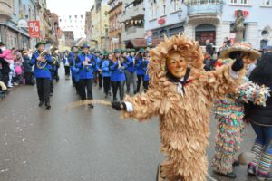 Die Moderatoren Berthold Damm und Manfred Lehmann nutzten die Gelegenheit bis der Zug von der Lindenbrücke am Rathaus angekommen war, um den Besuchern mehr über die traditionellen Gestalten der Zeller Fasend zu berichten. Die Bändele seien früher aus Abfallpapier aus der Papierfabrik zwischen Zell und Biberach gemacht worden, war da zu erfahren, genauso wie die Tatsache, dass für ein Schneckenhüsli-Gewand ungefähr 2.500 Schneckenhäuser gebraucht werden. Der Kartennarro sei annodazumal aus abgelegten Spielkarten gefertigt und der Welschkornnarro sei eigentlich lediglich die Vertretung für den ursprünglichen Schilfnarro. Als für