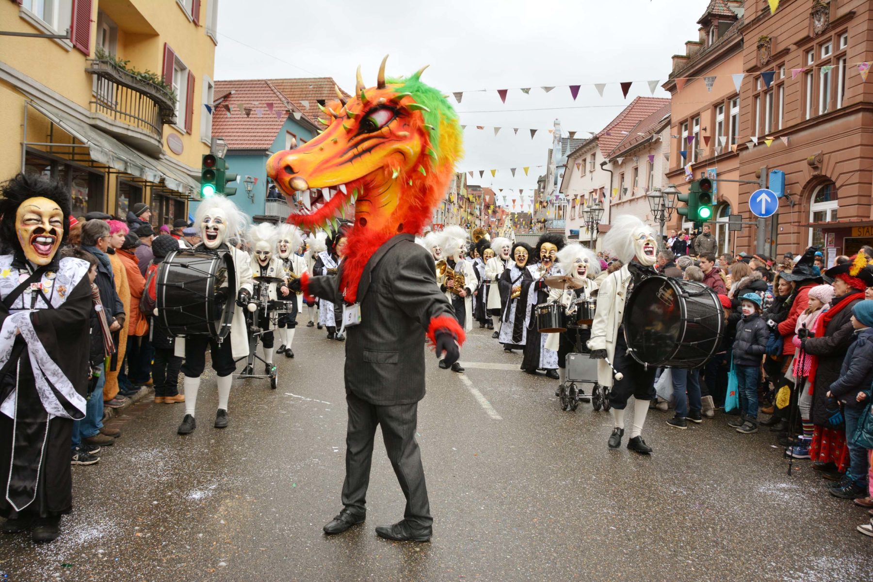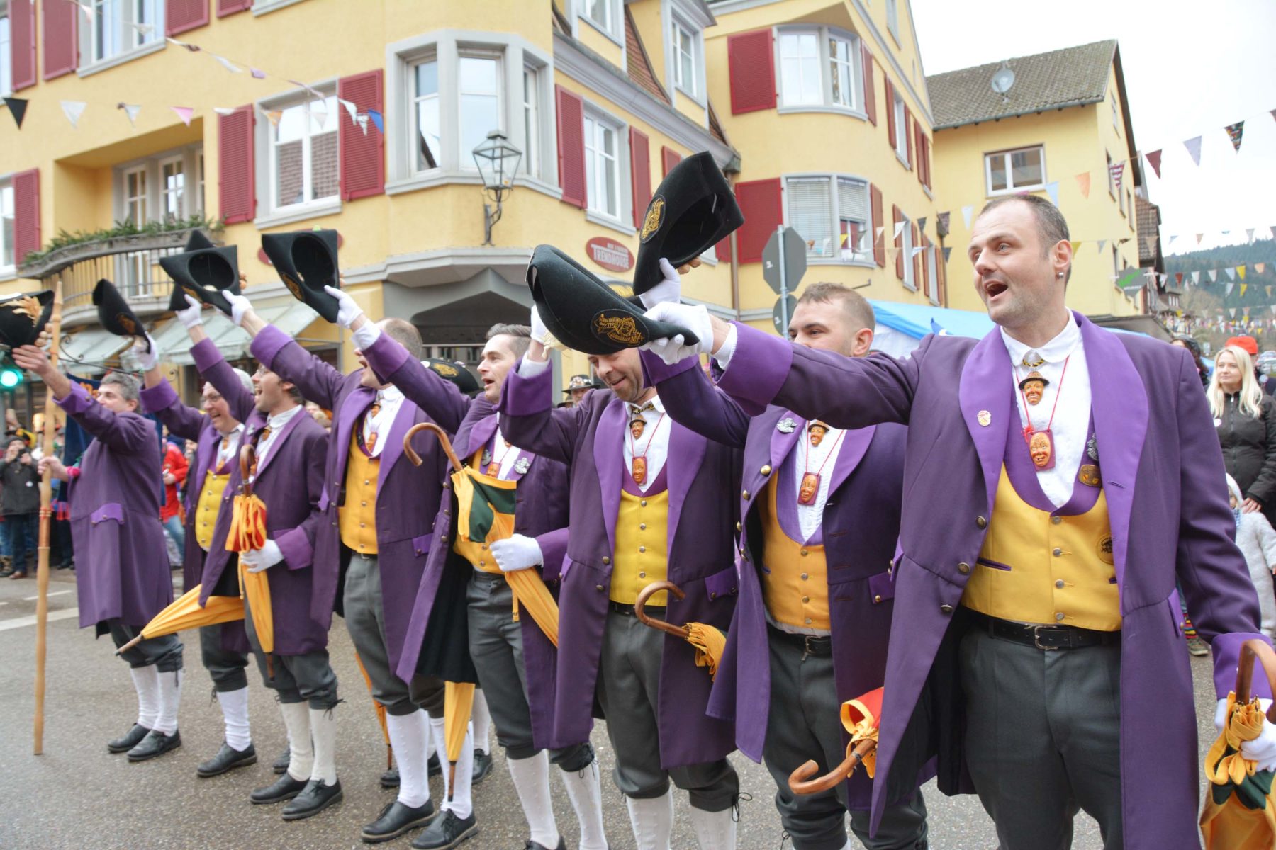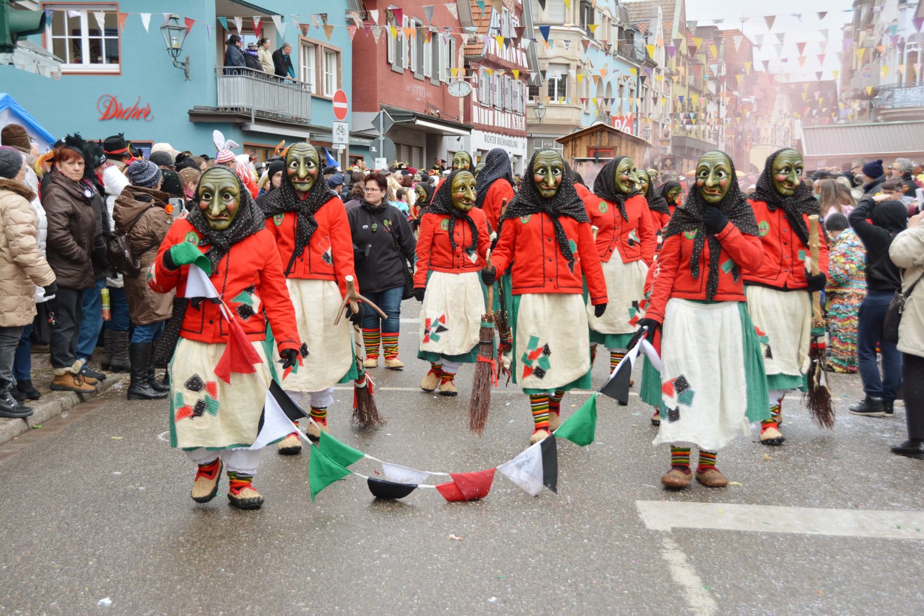Foto: Hanspeter SchwendemannDie Dramaturgie ist gesetzt: Begleitet von Musik trifft der Narrenrat um 14 Uhr auf dem Kanzleiplatz ein. Der Zunftmeister spricht die traditionellen Worte, die Storchenturmglocken läuten. Es öffnet sich das Narrengrab, »hoorig, hoorig« schallt es aus den Kehlen. Zum Zeller Narrenmarsch erobern die Narrenfiguren die Stadt. Die Bändele- und Welschkorn-Narros knallen mit ihren Saubloodere, die Karten- und Schneckenhüsli-Narros klappern mit ihren Scheren. Glückselige Fasend in Zell am Harmersbach! Die Narro-Erweckung ist gelungen, der Umzug kann beginnen.