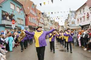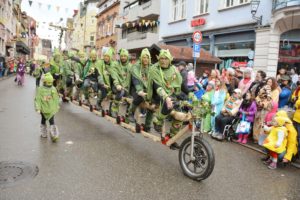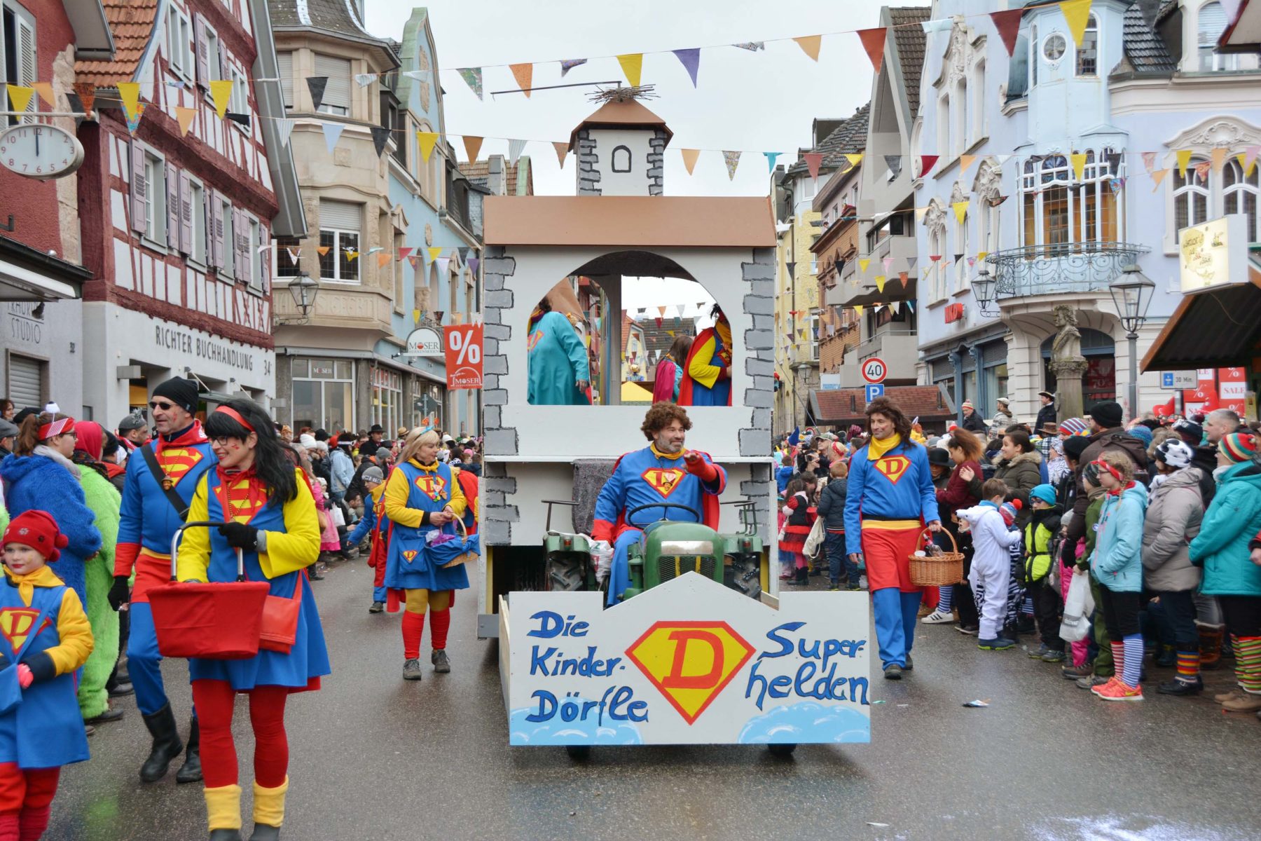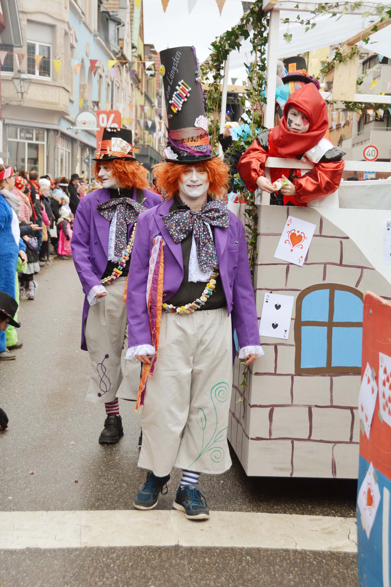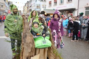 Den Anfang machten wie immer die traditionellen Zeller Narrengestalten. Den Rekord vom letzten Jahr konnten sie in der Anzahl zwar nicht erreichen, dafür waren scheinbar diesmal besonders viele Bändele-Kinder mit dabei. An der Spitze des Kinderumzugs, der 2018 unter dem Motto »Superhelden und Alice außer Rand und Band, Kinderfasend im Wunderland« stand, zog die »Insel« als Wichtel in Koboldgestalt beerenfarbig, grün und blau durch die Stadt. Das »Dörfle« feierte das Kinder-Fasendsmärchen mit Superhelden und hatte ganz märchenhaft auf ihrem Wagen den Storchenturm mit Meister Adebars Storchennest mitgebracht.