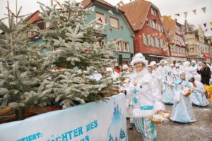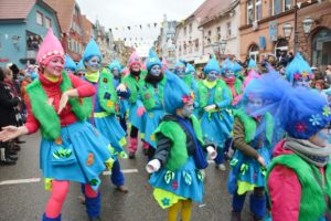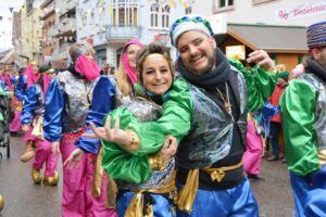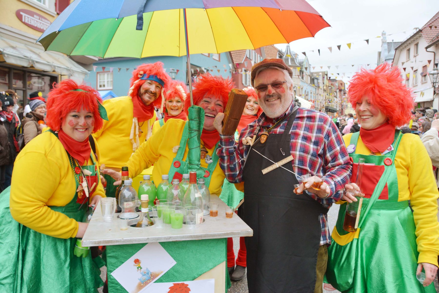Grinsekatzen, Herzköniginnen und Hutmacher schlossen sich an. Die Entersbacher entführten die Zuschauer in Tim Burtons Welt von »Alice im Wunderland« – ein groteskes Fantasy-Märchen, das die Entersbacher mit viel Liebe zum Detail und toll geschminkten Gesichtern auf die Straße brachten. »Dance, Dance, Dance« hieß es, als die Städtle-Trolle mit blauen Haaren und grünen Frasen unter dem Motto »Drollige Drolle drehen durch« die Hauptstraße eroberten. Mit dabei: ein Glücksrad, an dem auch Bürgermeister Pfundstein sein Schicksal auf die Probe stellte und sogleich mit einem Narrentrank belohnt wurde. Auf die Hombacher Musik folgten jede Menge Pumuckl und Pumuckelinen aus Neuhausen. Die Klabautermänner und Klabauterfrauen waren an ihren roten Haaren, gelben Shirts und grünen Hosen unschwer zu erkennen und die Nachwuchspumuckelchen rollten im Laufstall mit. Die Klein-Pariser hatten sich »Schneewittchen aus dem Zwergenwald« als Motto ausgesucht und so mancher Zuschauer durfte ein Bad im Schneewittchen-Konfetti-Glassarg nehmen. Mit mehr als 100 Zwergen und Schneewittchen war die Gemeinschaft groß vertreten.