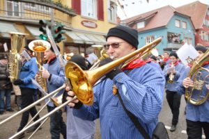 Besonders freuen konnte sich die Narrenzunft über Gäste aus Baumes-les-Dames. Gleich ein ganzer Bus voller Liebhaber des närrischen Treibens hatte am Sonntag den Weg in die badische Partnergemeinde gefunden und feierte vor dem Rathaus mit.