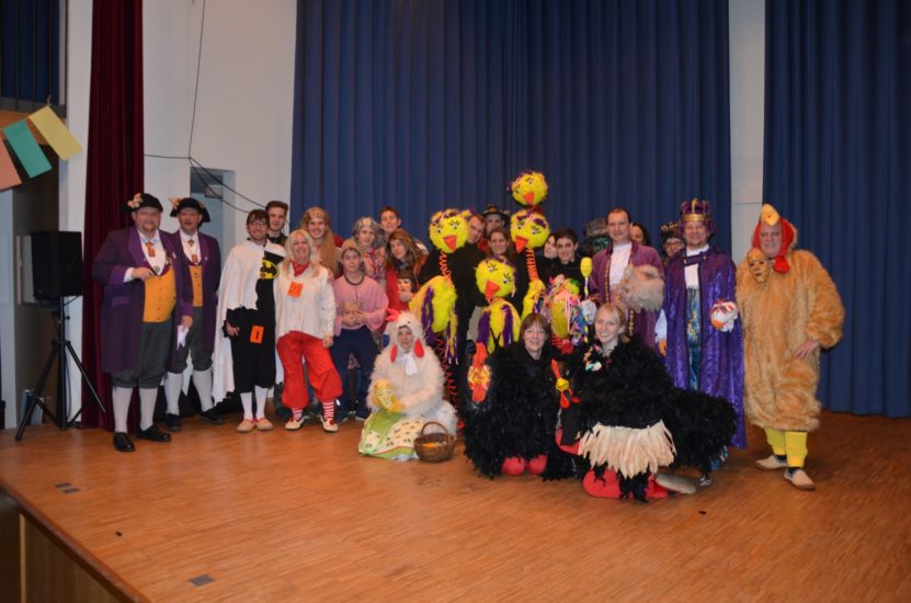 Für »die wahre Geschichte von Rotkäppchen« gab es den ersten Platz. Tanja Kienzler, Jannik Schnurr, Lutz Brucher, Nils Kienzler, Niklas Stubert, Hannes Märtin, Lukas Petrahn erzählten das Grimm-Märchen neu. Was die Kostüme einfacher gestaltet waren, hat die Gruppe mit guter Musikauswahl wettgemacht. Sie hat sich ein Medley des Comedy-Duos »Söhne Mama’s« ausgeliehen. Darin sind deutsche Schlager und deutsche Popsongs so aneinander geschnitten, dass die verschiedenen Strophen und Verse der Lieder das Märchen neu erzählen. Mit der skurrilen und sehr lustigen Darbietung holte sich die Gruppe den Preismaskentitel.