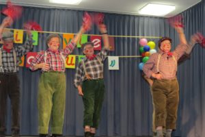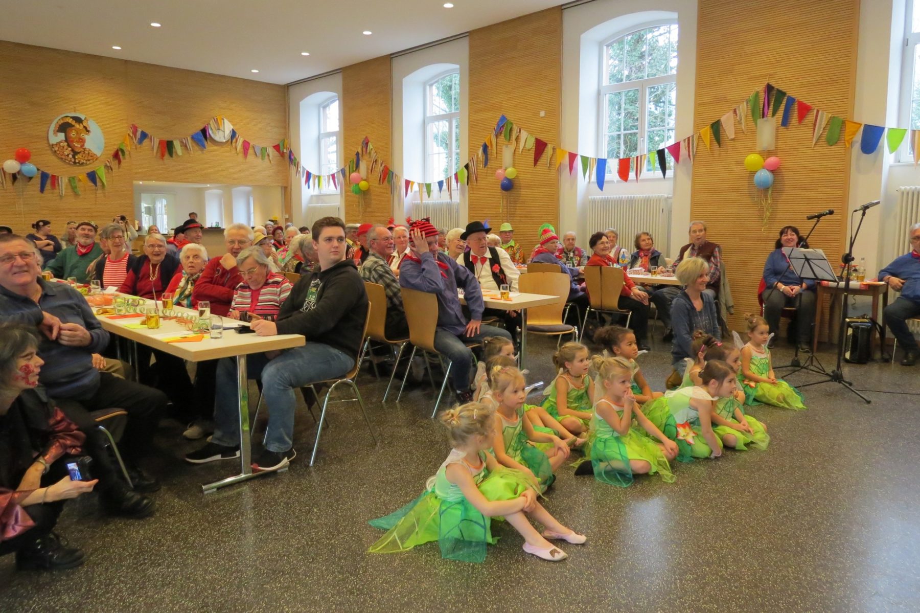 Die Kindertanzgruppen von Susi Dangl gehören zum festen Programm der Seniorenfasend. Zuerst hatten die Feen ihren Auftritt. 11 Mädchen von 5 bis 6 Jahren zeigten ihren anmutigen Tanz mit ihren leuchtend grünen Feenkostümen wirklich süß anzusehen. Danach kamen die spanischen Senoritas dran; die etwas größeren Kinder konnten sich geschickt zur Musik bewegen und bildeten am Ende eine schöne Abschlusspose. Beide Gruppen erhielten viel Beifall und zeigten ihren Tanz gern ein zweites Mal. Vor der Bühne intonierten die Musiker dann das bekannte »Fliegerlied«, das die Kinder mit ihren Bewegungen begleiteten.
