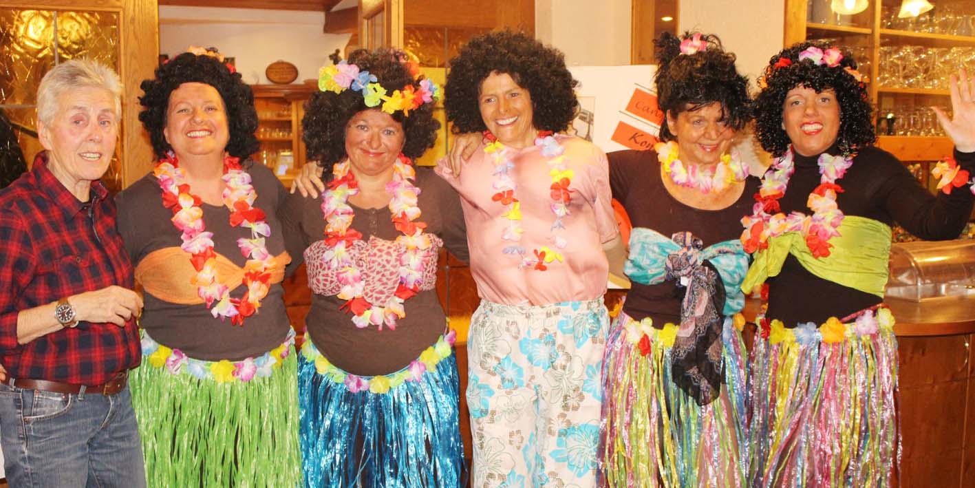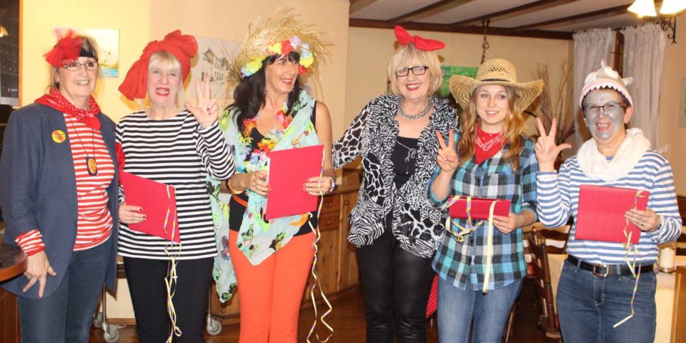 Pünktlich um 19 Uhr starteten sie ihren Einmarsch als Polonaise durch das ganze Lokal, sehr zur Freude der anwesenden Gäste im Gasthaus »Ochsen«. Danach ging es Schlag auf Schlag weiter mit dem närrischen Programm. Den Anfang machte Alt-Dame Rita, edel in Pelz gewandet, mit einem närrischen Rückblick auf die Gastkonzerte. Die weiteren Highlights waren ein Konzertbesuch als Pantomime, die Zuckerpflaumen, »Ein Hoch auf uns« gefolgt vom Jubiläumsjahr über »Frauen seid bereit« mit dem Super-Song »In jeder Frau steckt ein Stück Hefe«, da groovten die »Tanten« voll mit. Eine Schnurrantin brachte die Frauen auf den neuesten Stand in Sachen »Das bisschen Haushalt«. Alles witzige, lustige und toll ausgedachte Beiträge. Ausgelassene Stimmung, schöne Kostüme – wieder einmal ein sehr gelungener Kappenabend.