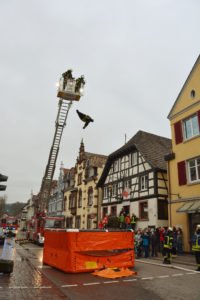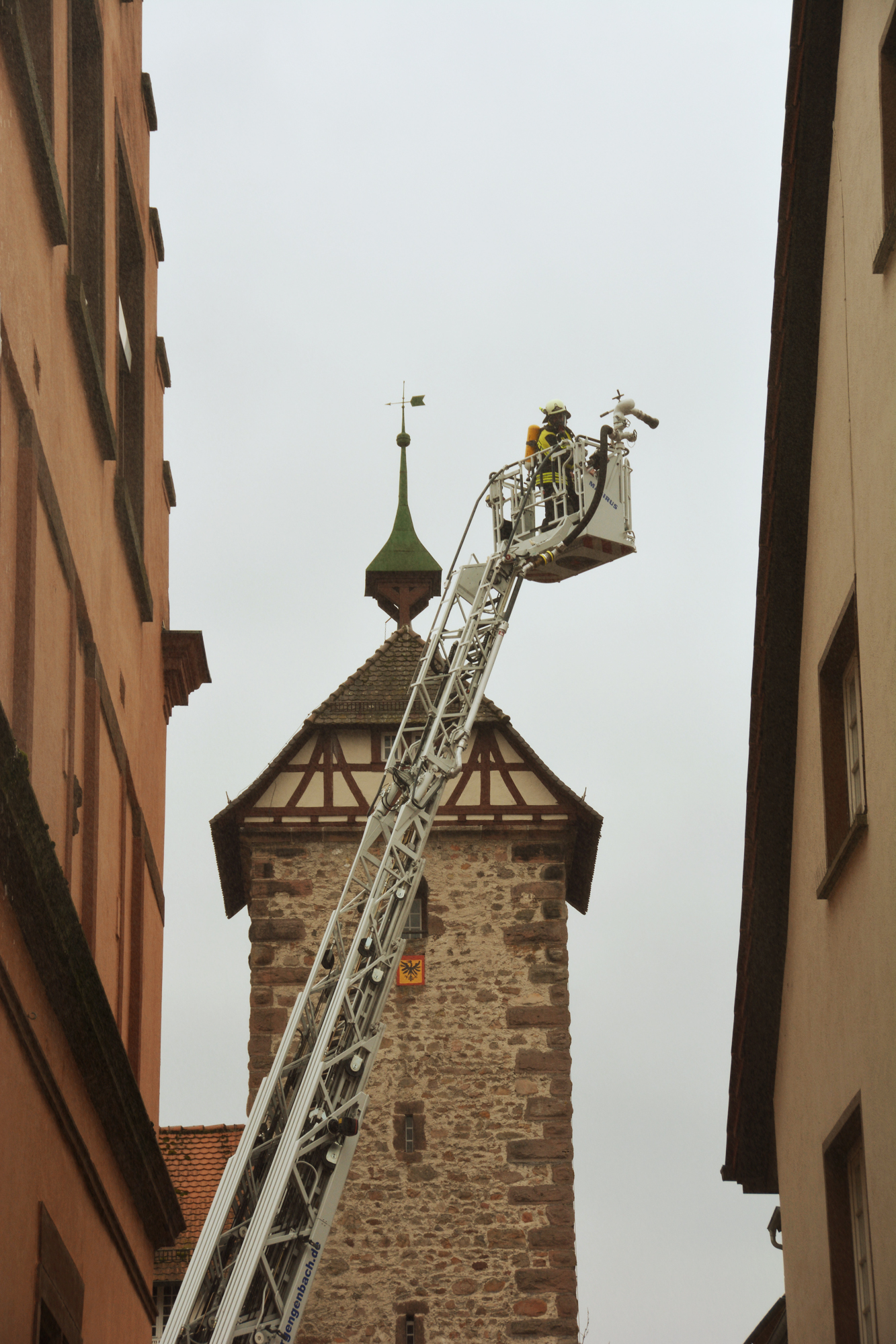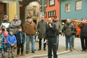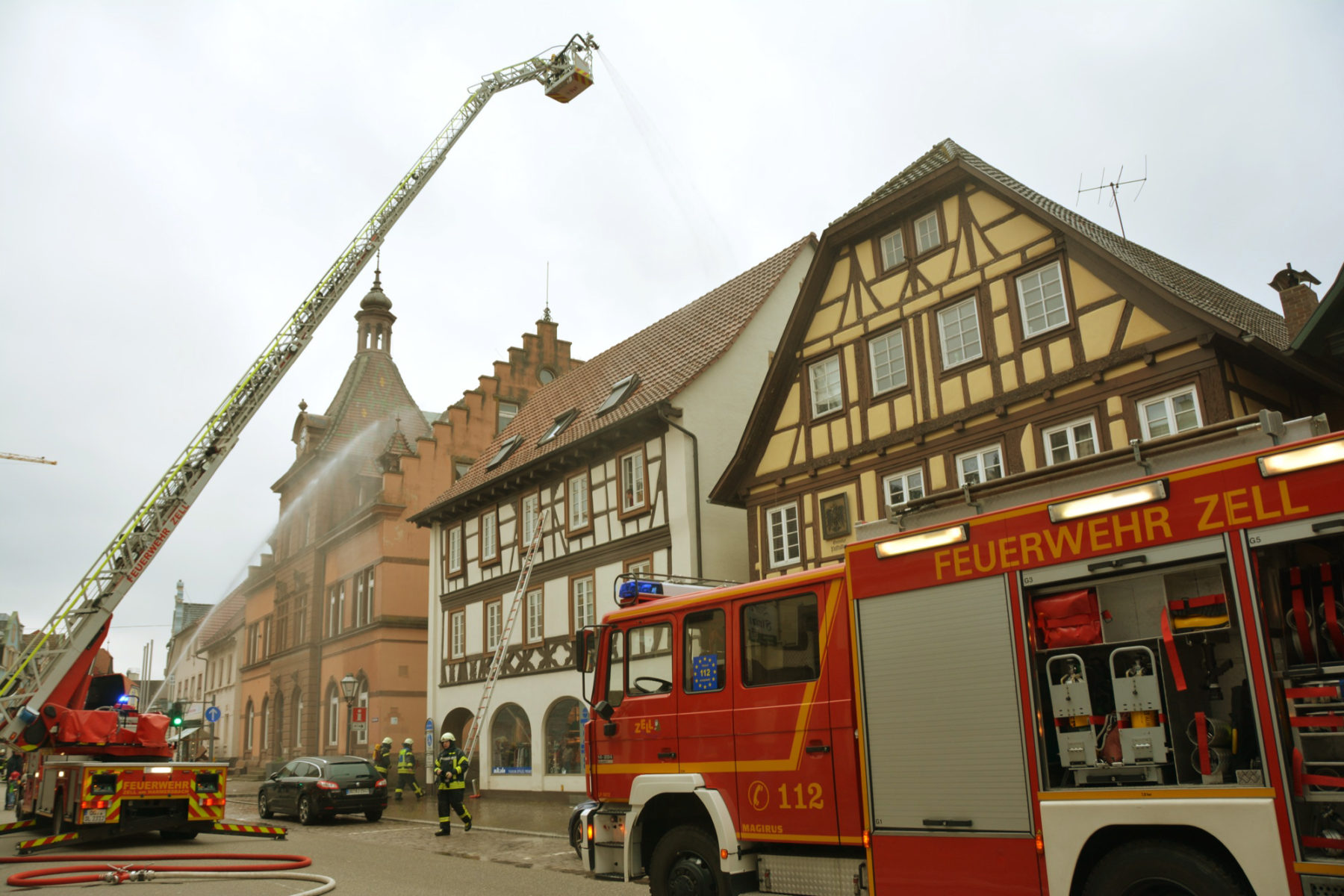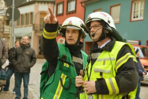 »Der Einsatz von drei Drehleitern wäre besser«, betonte Gesamtkommandant Florian Lehmann, der für die Zuschauer den Übungsverlauf erläuterte. Neben der Drehleiter der Zeller Feuerwehr wurde zusätzlich noch die Drehleiter aus Gengenbach zum Unglücksort gerufen. Eine dritte Drehleiter wäre noch besser, um die Nachbargebäude vor einem Übergreifen der Flammen schützen zu können. In Hausach sei eine weitere Drehleiter stationiert, in Offenburg sind es zwei. Florian Lehmann erinnerte daran, dass bei den historischen Stadtbränden ganze Stadtviertel in Schutt und Asche gelegt wurden und das Feuer sogar über die Hauptstraße hinweg übergesprungen sei. Die enge Bebauung sei auch heute noch für die Feuerwehr eine besondere Herausforderung. Glücklicherweise sei es in den vergangenen Jahren in der Stadtmitte nur zu kleinen Bränden gekommen.