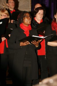 Einen festen Platz hat im Programm des Chors inzwischen ein afrikanischer Beitrag. Dies hat nicht zuletzt persönliche Gründe. Chormitglied Marguerite Kraft stammt aus Kamerun. Beim Titel »Ukuthula« stellte sie wie schon des Öfteren die Vorsängerin. Stefan Stehle räumte bei der Moderation ein, dass der Inhalt des Liedes dem Chor zwar unbekannt, die Melodie und Rhythmik aber wunderschön seien. Beim folgenden Stück »Laduma« stellte der Chor seine Percussions-Künste vor. Die Zuhörer wurden durch Pfeifen und Unken in einen Urwald geführt, in dem der Regen auf die Blätter zu Klatschen begann. Für den extravaganten Gag gab es Sonder-Applaus.