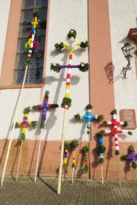Foto: Gisela Albrecht»Es ist ein schöner Brauch, den Gottesdienst draußen zu beginnen«, sagte Pfarrer Gerner in seiner Begrüßung auf dem Kirchplatz. Die Palmen seien ein Zeichen für das Leben und die Hoffnung. »Da, wo ich herkomme, gibt es diese großen Palmen nicht. Sondern nur kleine Palmbüschel.« Es habe ihn fasziniert, hier diese großen Palmstöcke zu sehen. Gerne übernahm er die Aufgabe, die großen Palmen an der Kirchenwand, die Palmstöcke der Kommunionkinder und die kleinen Palmbüschel in den Händen der Gemeindemitglieder auf dem Kirchplatz zu segnen.