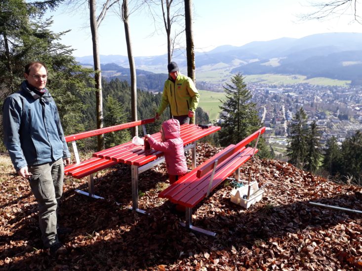 Die alte urige Sitzgruppe am Umsetzer im Badwald wird nun so langsam zuwachsen, dann ist es vorbei mit der schönen Aussicht. Die neue Sitzgruppe wurde ca. 100 Meter entfernt auf dem Kammweg aufgestellt. Eine neu entstandene Lichtung ermöglicht an dem neuen Standort eine herrliche Aussicht. Durch eine Spende hat der Schwarzwaldverein Zell die Möglichkeit erhalten, die Sitzgruppe mit zwei Bänken und Tisch anzuschaffen.