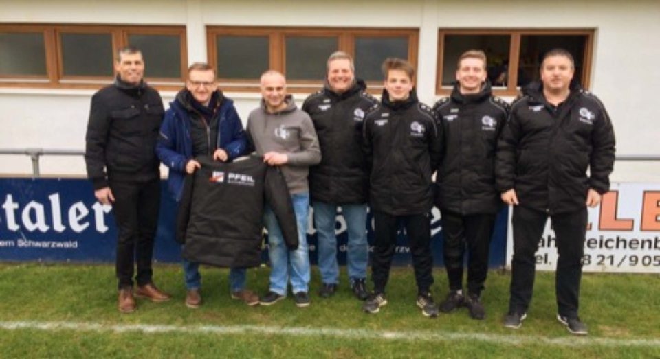 Möglich gemacht wurde dieses durch die tatkräftige Unterstützung von Uwe Harter, Prokurist der Pfeil Sicherung GmbH und ehemaliger Spieler der ersten Mannschaft. Zum einen ist das neue Outfit funktional, schließlich stehen die Trainer bei Wind und Wetter auf dem Sportplatz und betreuen regelmäßig etwa 150 Kinder und Jugendliche. Andererseits sorgt die neue Bekleidung für eine einheitliche Außendarstellung. Vorstand Christian Pristl und Jugendleiter Gaetano Nocerino bedankten sich für die großzügige Spende. Somit sind die Weichen für eine erfolgreiche Jugendarbeit gestellt!