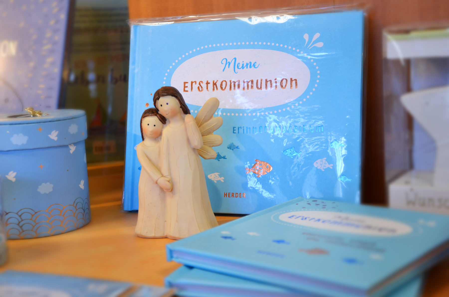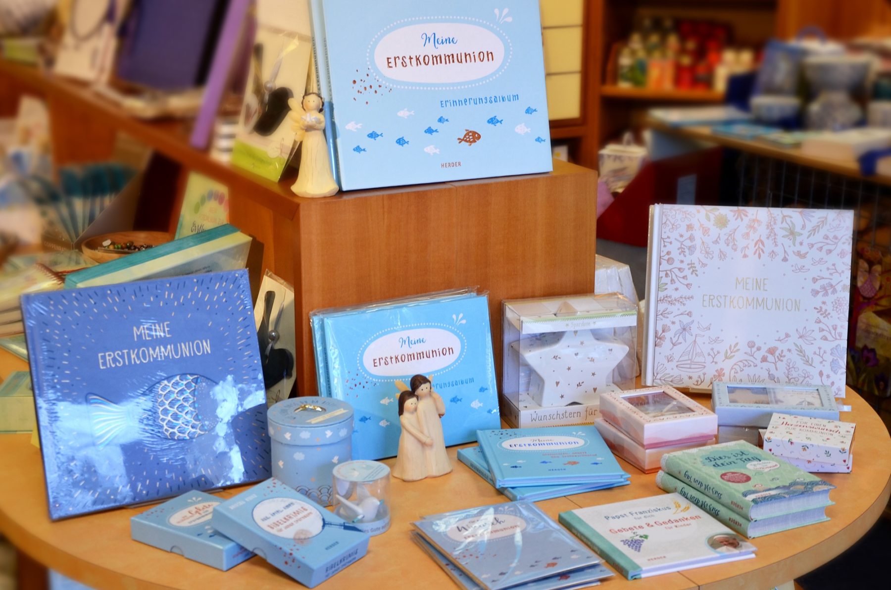 Bei »Rund ums Leben – Kopf« stehen die schönsten Kommuniongeschenke in großer Auswahl bereit: religiöse Geschenke, Schmuck für Kinder, alternative Geschenke und Ideen für Geldgeschenke. Dieses Warenangebot macht das Fachgeschäft zu einem Unikat in der Region. »Unsere Kunden können sich im Geschäft entscheiden: Möchte ich ein schönes Buch, einen christlichen Gegenstand, ein spannendes Spiel, Schmuck oder Geld schenken? Bei uns finden Sie alle diese Dinge.« Die schönsten Ideen haben Inhaberin Petra Kühnpast und ihr Team auf Thementischen geschmackvoll zusammmengestellt. So werden Vergleichen und Auswählen ganz leicht.