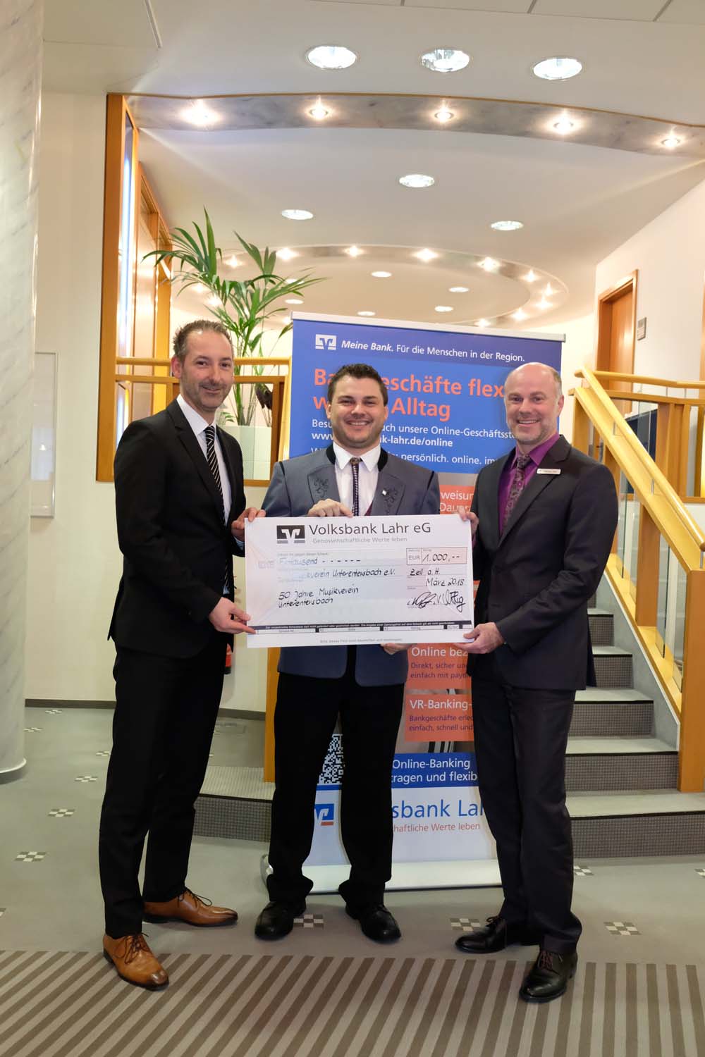 Anlässlich seines 50-jährigen Jubiläums überreichten gestern Volksbank-Regionalmarktleiter Rainer Griesbaum (links) und der Leiter des Kompetenzcenters Zell a. H. Mathias Hug (rechts) eine Spende in Höhe von 1.000 Euro an den 1. Vorsitzenden des MV Unterentersbach Markus Vollmer (Mitte).