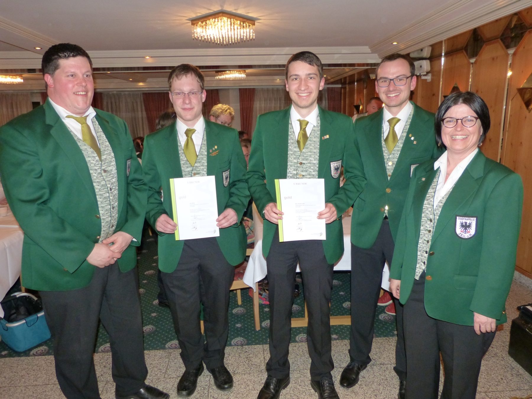 Jan Breig und Nico Armbruster (2./ 3. von links) wurden vom Vorstandsteam Georg Heitzmann (von links), Sebastian Grillich und Petra Kühnpast für das goldene Leistungsabzeichen beglückwünscht.
